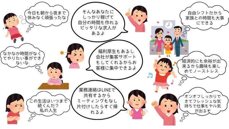 勤務時間 | シフト制 勤務時間詳細 実働時間:1日あたり8時間 平均勤務日数:1ヶ月あたり22日 10:00~19:00 時短勤務希望の場合はご相談ください! |