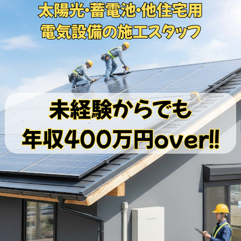 職種/仕事内容 | 仕事内容 稼げる仕事って、 体力的にも精神的にも大変でしょ? そう思われがちですがそうでもありません。 未経験の20代から高齢になっても活躍してくれるスタッフもおります! 当社の場合 ●なにせ仕事の依頼が豊富! ●未来への。スタッフの成長への先行投資! ●どんどん物価が高くなって、何するにも前よりお金かかるじゃん・・・ そんな状況、考え、想いで給料を高くしています! 心配しないで気楽に声かけてみてください! 面接でいろいろお話ししましょう! ==================== ⭐⭐⭐稼げる⭐⭐⭐ ✅未経験者入社でも初年度から【年収400万超え!!】 年収470万円以上も可能! ⇒月給33万5000円~+賞与年3回あります! 先輩の中には年収800万円以上の方もいます!! 仕事ができるようになればどんどん年収もUP!! ⭐⭐⭐休める(気兼ねなく)⭐⭐⭐ ✅無理なく続けられるようにお休みも充実♪ ⇒隔週休2日制&年3回の大型連休もあります! プライベートも大切にしながら働けます! また、スタッフ同士で相談して柔軟に休みをとれます!! ⭐⭐⭐仕事が安定⭐⭐⭐ ✅安定性バツグンです! ⇒家庭用の省エネ設備は東京都を はじめとして自治体の補助金制度があり、 需要は増加中です! 3ヶ月先まで工事の予定が埋まっています。 実際に2年前と比較して、 売上は2倍以上に増加しました! ⭐⭐⭐早く帰れる⭐⭐⭐ ✅基本的に業務は17時で終了します! (※現場により異なる) ⇒お客様が住んでいる 個人宅での設置のため、 早朝や夜間の業務はありません。 ※現場状況により13~14時などに 早上がりをする場合もあります。 ⭐⭐⭐ゆくゆくは資格もGET⭐⭐⭐ ✅働きながらスキル&資格をGETできます! ⇒電気工事士や電気施工管理技士をはじめ、 普通自動車免許についても資格取得の 支援制度があります! ==================== <具体的なお仕事内容> 蓄電池・太陽光・エコキュート・IHコンロなど、 省エネ設備を設置するお仕事です。 事務所に出社後、資材を車に積んで 各現場へと向かいます。 1つの現場を2~3名でチームを 組んで担当しますので 分からないことがあったら すぐに聞ける環境です。 未経験者の方には使用する道具の 名前や使い方から教えます! ⭐5名以上採用枠あり! まずはお気軽にご応募下さい♪ ―――――――――――――――― ⭐20~50代のスタッフが活躍中⭐ 電気工事士は、半数以上が未経験入社! そもそも現場仕事が初めて、 という方も多数! ■お電話での応募も受付けております。 【044-871-1022】 |