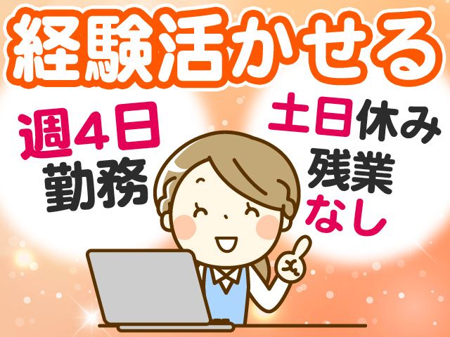 対象となる方 | 資格・経験 事務経験がある方 Excel・Wordの基本操作出来る方 \こんな方にオススメ/ ・仕事復帰を考えている方 ・事務経験を活かしたい方 ・モクモク作業が好きな方 ・平日も休みたい方 ・残業が少ない仕事を探している方 |