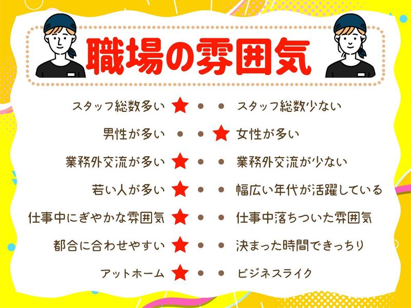 職種/仕事内容 | 仕事内容 総席数100席の大型店。 なので在籍スタッフ数も多く、 沢山の仲間に出会えて、楽しく働けます!!! 年末に向けて採用人数多めの大募集★ 同期を作るなら今がチャ~ンス◎ ■■■ 自慢の働きやすさ◎ ■■■ ✅「個室中心」×「全卓タッチパネルオーダー」! オーダー確認が楽々スムーズ♪ ✅「ホールだけ」「キッチンだけ」 自分の希望と適材適所選べます! ✅髪色自由!お洒落に制限かけず働けます! ✅嬉しい無料まかない有! ✅「1週間ごと」のシフト提出!融通有! ✅昇給制度あり!! シフト貢献度や頑張りは時給に還元! 時給もモチベーションもUP♪ <飲食店未経験OK!> ■■■■■■■■■■■■■■■■■■ ▼仕事内容 ―――――――――――― ■ホール業務 ・席へのご案内 ・オーダー取り(タッチパネル導入なので直接オーダーは少なめ) ・料理運び ・お会計 ・テーブル片づけ など ■キッチン補助 ・皿洗い ・野菜の簡単カット ・冷蔵庫から食材取り出し ・お皿の準備 ・揚げ物サポート調理 ・ドリンク作り(ビールを注いだり、カクテル作ったり) など調理補助に入ってもらいます。 開店前や合間に店内清掃もお願いします ▼こんなお店です ―――――――――――― ■地元市場で厳選した鮮魚と、 新鮮お野菜・鶏を使った料理が愉しめる 個室居酒屋です! 料理好きの優しい店長がいます。 ■10代高校生~大学生が多数在籍! 現正社員スタッフも若手★ 学生さん以外にも、20代半ば~30代のフリーターさん活躍中! 優しくて気さくな店長&スタッフばかりなので、 すぐに慣れると思います。 卒業まで続ける学生staffもたっくさん! 最初は人見知りな子でも「店長何言うてるんですか~!」って 冗談が言えるくらい和気あいあいとしてます(笑) ▼シフトについて ―――――――――――― 1週間ごとに提出。 「来月、県外のライブに行くので連休下さい!」 「資格試験が近づいているので、来月はシフト相談させて下さい」 などシフトの相談OK! 面接時に「これぐらい稼ぎたい」などもご相談下さいね ★1日の最大勤務人数4〜5人程 大型店舗なのでスタッフ同士連携しながら 和気あいあいとした雰囲気で働いています。 |