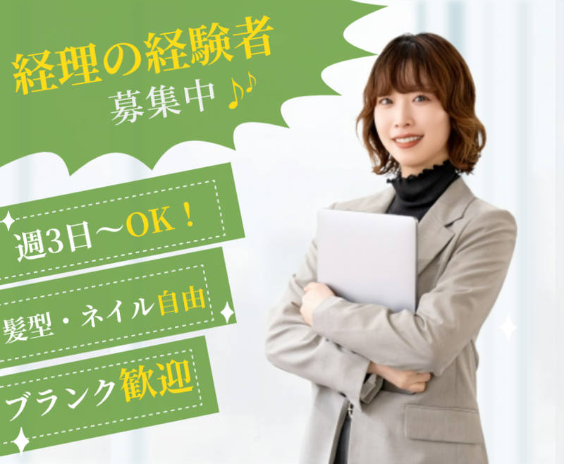 対象となる方 | 求めている人材 【MUST】 ・経理、または総務の知識をお持ちの方(経験不問) ・基本的なPCスキル(Excelでの四則演算、SUM関数など) 【WANT】 ・日商簿記3級以上の資格をお持ちの方 ・月次決算のサポート経験がある方 ・自ら仕事を見つけ、前向きに取り組める方 ・音楽や飲食など、エンタメカルチャーが好きな方 ✧˖°✧˖°✧˖°✧˖°✧˖°✧˖°✧˖°✧˖°✧˖°✧˖° 基本的なPCスキルがあれば、 請求書処理や会計ソフトの使い方は 丁寧にお教えします。 服装・髪型自由な環境で、あなたらしく成長できます。 ✧˖°✧˖°✧˖°✧˖°✧˖°✧˖°✧˖°✧˖°✧˖°✧˖° |