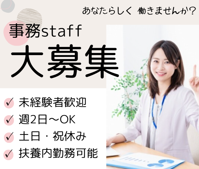 対象となる方 | 求めている人材 ✅PCの基本操作(Excel・Word)ができる方 ✅学歴・資格不問、事務未経験OK ✅人柄と意欲を重視します! \こんな方、大歓迎!/ ・コミュニケーションを大切にできる方 ・安定企業で長く働きたい方 ・家庭と両立しながら無理なく働きたい方 |