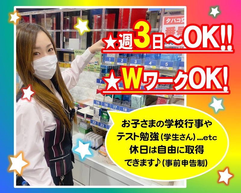 勤務時間 | シフト制 勤務時間詳細 ◆早番 8:55~16:35 (休憩 60分) ◆遅番 16:20~24:00 (休憩 60分) ※週3日~OK ※土日勤務も歓迎 ※シフト制 ※休み希望はお気軽にご相談ください◎ |