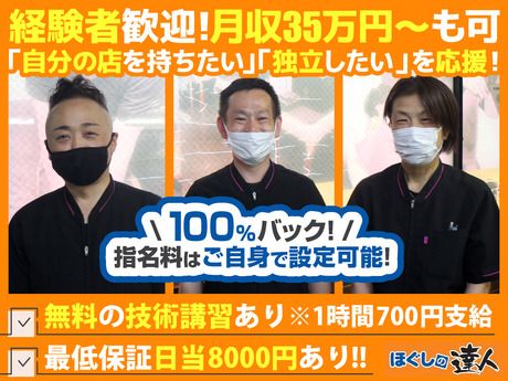 職種/仕事内容 | 仕事内容 ■経験を活かしてしっかり稼げる職場!「前職より収入が上がった」の声多数! ーリラクゼーション経験者のあなたへー 「件数が少なくて思ったより稼げない…」 「経験があるのに十分に活かせていない…」 こんなお悩みをお持ちの方は是非一度ご応募ください! 【当店で働くメリット多数!】 ■指名料は自分で設定OK&100%バック! ■施術単価 60分2,020円~2,700円!高水準! ■経験を活かせる自由シフト&ノルマなし! ■高稼働日には8件以上の施術実績も! ■WワークOK!ノルマなし!髪型自由! ■最低保証あり ■地下鉄「成増駅」より徒歩0分の好立地 【仕事内容】 お客様の不調をヒアリングして、 全身ほぐし施術(マッサージ)を行うお仕事です。 新メニューとして、頭ほぐしや足ほぐしも展開中! 【具体的には…】 ・カウンセリング:お客様の体の状態や悩みをヒアリング ・施術:指圧・ストレッチ・マッサージなどを用いた施術 ・アフターケア:施術後のアドバイスやストレッチ指導 その他付随業務として、接客、受付、ご案内もお願いします! 【1日の平均施術件数】 平日4~6件 土日6~8件 建物は駅前に面しているため、 お客様の動きも多く集客力が高い店舗です。 しっかりと施術に入れる環境の為、月収30万以上も可能! 最初は勤務数は少なめに設定して、 いずれは長く続けたい方にもオススメです◎ ノルマ・営業トークもなく、 人間関係のストレスがない環境です! 【無料の技術講習あり!(1h700円の手当あり)】入社後も成長可能!充実のサポート体制 入社してからも更に活躍できるように 充実したサポート体制をご用意しております! 丁寧なマンツーマン研修で、 スクールで数十万円かかる手技を無料で学べます! 【例えば……】 ・技術や接客スキルを基礎から丁寧に指導します ・経験豊富なスタッフの下で、 実践を通してスキルアップをサポートします! ・専門知識や整体技術を身につけられるので 働きながら学べる環境! 【現在働かれている方をご紹介】 ●子育ても頑張るママAさん(30代) 「接客の経験を活かして『癒し』を提供したいと思い挑戦しました。 マッサー ジや整体の基礎が身につくので、家族にも喜ばれますよ」 ●本格的にスキルを学びたいBさん/30代 「失業中だったのでとにかく手に職を付けたいの一心で始めました。 オーナーが親身にゼロから教えてくれたので、 どんどん自信がつきました!」 生活サイクルに合わせた働き方が可能! 「週3~4日で働きたい」「勉強しながら働きたい」と お考えのプライベート重視派の方や、 「週5フルタイムでレギュラーワークがしたい」 「資格を活かして仕事がしたい」とお考えの収入重視派の方など 生活サイクルに合わせて勤務していただけます! 休憩時間は一時帰宅も可能です! 【スタッフインタビュー】 Q:1日にどのくらい施術をしていますか? A: 施術時間は1日平均6~7.5時間ほど実施します。 インターバル(施術の合間)は10分間隔で 休憩などは予約状況を見て、自分のタイミングで取っています。 Q:この業界に入った理由はなんですか? A:元々別業界で会社員として働いていた未経験者ですが、 学生時代からリラクゼーション業界にも興味がありました。 前職を退職したタイミングで挑戦してみようと思い、 家から近い成増店の求人を見て応募しました。 Q:どんな人が働いていますか? A:私のような元会社員もいれば、 柔道整復師の資格をお持ちの方、 芸人、フリーター、役者などもいらっしゃいます。 Q:この店舗の魅力はなんですか? A: 1つ目は、安定して施術に入れる環境です。 駅チカでアクセスが良く、 平日でも満床になることが多いため、 土日も含めてしっかり稼げますし、技術も磨けます。 2つ目は、未経験でも安心して活躍できる体制が整っていることです。 経験豊富な先輩が丁寧にサポートしてくれますし、 研修後にいきなり新規対応!ということはなく、 先輩達が1日4本程度で予約調整をしてくれます。 最初は20分のインターバルで設定しています。 技術は身につけば一生もの それを無料で教えてもらうっていいですよね♪ 3つ目は、新しい技術も学べる環境がある点です。 去年からアロマオイルを使った足ほぐしプランやオイルを使わないヘッドスパ=頭ほぐしプランを導入。 お客様にも大好評で嬉しい声も多くいただいております。 リピーターも多く給与もスキルも高めることができます。 \アルバイトより自由で、しっかり稼げる!/業務委託ってどんな働き方? 「業務委託って、むずかしそう…」 「アルバイトとどう違うの?」 業務委託と聞くとそんな疑問を持つ方も多いと思います。 実は,お店と“雇用契約”ではなく“仕事の契約”を結ぶ、 自由度の高い働き方なんです♪ たとえば… 「カフェでバイトする」のではなく、 「お店を借りて営業する」ようなスタイル。 とはいえ、お客様も場所も、お店がすべて用意済み! なので、 ◆自分のペースで働ける ◆でも一人きりじゃない という“いいとこどり”な働き方ができます◎ ■ 業務