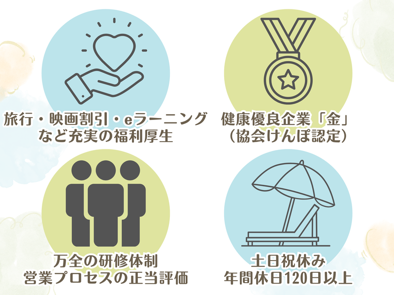 休日休暇 | 休日休暇 ✨完全週休2日制(土日)✨ ✨年間休日125日✨ ・祝日 ・有給休暇 ・夏季休暇 ・年末年始休暇(12/29~1/4) ・慶弔休暇 ・産前・産後休暇 ・育児休暇 ・介護休暇 ・ボランティア休暇 ・赴任休暇 など |