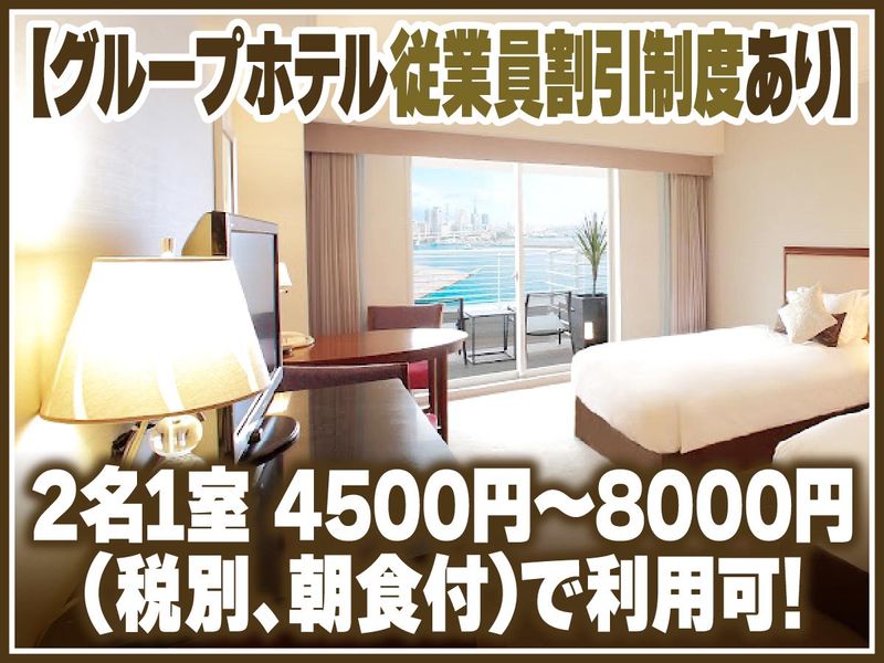 待遇・福利厚生 | 【保険制度】 雇用保険、労災保険、健康保険、厚生年金 【福利厚生】 待遇・福利厚生 【福利厚生】 ●交通費全額支給 ●社会保険完備 ●社員食堂あり(1食200円) ●グループホテル従業員割引制度有(ヒルトン東京お台場・オリエンタルホテル東京ベイ・なんばオリエンタルホテル・神戸メリケンパークオリエンタルホテル・ホテル日航アリビラ等)2名1室料金 4500円~8000円(税別、朝食付)で利用可! ●資格取得奨励金制度有(全71資格/6ヵ月以上在籍の方) ●更衣室・個人ロッカー完備 ●制服貸与(クリーニングもホテルで実施)/無料 ●休憩室・シャワー室あり ●有給休暇有 |