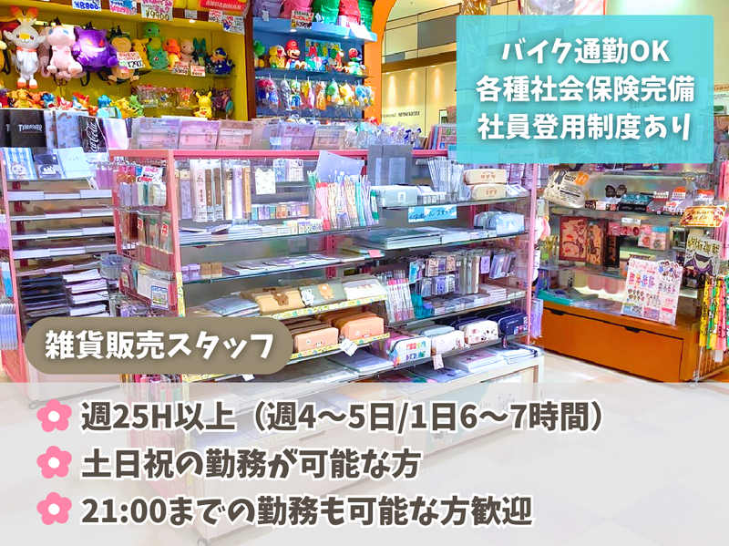 職場環境・雰囲気 | 職場環境 20~30代スタッフを中心に活躍中! 店内は人気キャラのグッズや海外発のお菓子など、心がときめくカワイイ商品でいっぱいです✨ フルタイムで勤務できる方、長期勤務できる方、ステップアップ希望の方大歓迎です! バイク通勤OK◎ 喫煙所:喫煙所あり(屋内) |