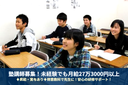職種/仕事内容 | 仕事内容 ■未経験でも月給27万3000円以上!賞与年2回支給! ■年3回の長期休暇あり!プライベートも大切に! ■得意な教科で先生になる!安心の研修サポート! ■ノルマ・休日出勤なし。授業に集中できる環境! 【仕事内容】 地域密着型の学習塾で、子どもたちの未来と、 ご自身の安定した未来を描きませんか。 創業50年以上の歴史を持つ『進学教室 千里学院』で、 正社員として子どもたちの成長を支えるお仕事です。 私たちが何よりも大切にしているのは、 社員一人ひとりが安心して長く働ける環境。 充実した待遇と休日制度のもと、教育という やりがいのある仕事にじっくりと向き合えます。 ===具体的な業務内容=== ◆小中学生を対象とした授業を担当 1クラス15名前後なので、生徒一人ひとりに しっかり向き合って指導することができます。 ◆授業の準備 全学年、全科目に年間カリキュラムがあるので、 それに沿って授業の準備をすることができます。 ◆質問・補習 授業の前後に質問にくる子がいたらポイントを わかりやすく教えてあげてください。 ◆担任業務と進路指導 千里学院の一番の特徴は『クラス担任制』 あなたがクラス担任となり、子どもたちに 勉強を教えるだけでなく、勉強の仕方や 進路の相談にも乗ってあげてください。 ☆強引な営業やノルマはありません 子どもたちの指導に専念できる環境です。 ~~~入社後の流れ~~~ まずは授業見学からスタート! あなたのペースも考慮しながら少しずつ 業務をお任せします。 得意教科を担当できるのでご安心ください。 講師として経験を積むと、将来的には 教室運営を担う教室長(課長職)や、 会社全体の経営を担う取締役への キャリアアップも可能です。 |