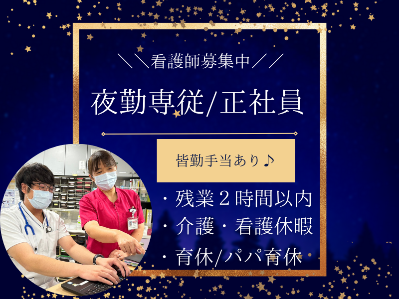 職種/仕事内容 | 仕事内容 -アピールポイント- ・残業月2h以下、オンコールなし! ・賞与前年度実績3.4~3.5ヵ月(年2回) ・院内に託児所あり! ・介護、看護休暇等実績あり! ・育休取得100% ・30代〜50代活躍中 「 履歴書等の書類が上手に書けなくてもOK!」 ⇓⇓⇓⇓ 電話でのご応募も受付中 ⇓⇓⇓⇓ 出来るだけ多くの方とスピーディーに お会いしたいと考えておりますので お気軽にお問い合わせください! 04-2928-1000 (担当:採用係まで) ⋱⋰⋱⋰⋱⋰⋱⋰⋱⋰⋱⋰⋱⋰⋱ 《安心安全で質の高い患者様本位の医療を一緒に提供しませんか》 ・ブランク歓迎!安心の教育体制で少しずつ学べます! ・子育てママ・パパさん応援!託児所併設! ・住宅手当や育児・介護休暇など、充実の福利厚生あり! ・20代〜30代の若手、40代〜50代の中高年ミドルが活躍中! 少しでも気になる方はお電話下さい! Web面接も受け付けてます! 当院において夜勤看護業務全般をお願い致します。 ※まずは日勤にて約2週間程度お仕事に慣れていただきます。 その後先輩職員同行の上、夜勤業務スタートになります。 <主な業務内容> ・入院患者様の体調変化の対応、巡視 バイタルチェック、カルテ整理 寝たきりの患者様の体位変換 点滴実施、服薬管理 等 その他付随業務 ※当院は療養病床、特殊疾患病棟、地域包括病棟があります。 【職場環境】 『子育てに理解がある職場』 敷地内に保育室あり お互い様精神があって 「熱が出て保育園から呼ばれました」→「今すぐ行っていいですよ!」 という会話もチラホラ!近いから安心✨ 【夜勤体制】 ・看護職員2名+遅番又は夜勤1名 ・補助者1名+遅番1名 - 【雇用形態】 正社員 ※定年満60歳(再雇用制度あり65歳まで) |