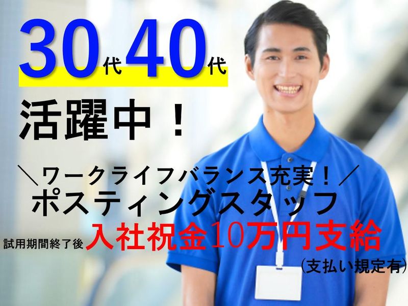 職種/仕事内容 | 仕事内容 業務拡大に伴う増員募集! 頑張った分だけしっかり給与に還元! 自分のペースでコツコツ働ける! \\求人のポイント// ⏩試用期間終了後、入社祝金10万円支給! ※入社祝金支給には規定あり ⏩日中勤務!!規則正しい生活が可能◎ ⏩成長に応じて収入アップのチャンスあり ⏩生活に合わせて休日の調整OK ⏩普通自動車免許をお持ちの方優遇✨ ⏩慣れてくれば一部フレックス制も可 ┈┈┈┈┈┈┈┈┈┈┈┈┈┈┈┈┈┈ ⭐仕事内容  ̄ ̄ ̄V ̄ ̄ ̄ ̄ ̄ ̄ ̄ ̄ ̄ ̄ ̄ ̄ ̄ ̄ ̄ チラシや新聞のポスティング業務です。 投函先は戸建て住宅やマンションなど さまざまです。 チラシの種類によっては配布方法が 異なる場合がありますが 研修でしっかりとお教えします◎ 安心のサポート体制があるので 未経験でも大丈夫です! <具体的な仕事内容> ✅配布するチラシの積み込み ✅各現場へ移動、ポスティング ✅配布中と完了後の報告作業 ※休憩時間は自由に設定できます。 自分の体調やペースに合わせられるので 無理なく続けられて働きやすい環境です ※1日平均3,000枚程度のポスティングを お願いしています。 ※業務に慣れてきた際には現場から直帰や 一部フレックス制を導入しています。 【フレックス制の例】 3日間で10,000枚ポスティングの 依頼をした場合、ポスティングの 時間やペースはご本人にお任せします。 ⭐今後もニーズのある"チラシ"  ̄ ̄ ̄V ̄ ̄ ̄ ̄ ̄ ̄ ̄ ̄ ̄ ̄ ̄ ̄ ̄ ̄ ̄ ネットが普及している昨今、チラシ広告の ニーズは少なくなりつつあります。 一方で業界によっては欠かせないツール として今でも、そしてこれからも必要と されると思っています! 例えば、共働きの家族、 「今日は仕事で疲れたから 晩御飯は何か注文しよう」 そう思った時に、ポストを開いたときに 一枚のピザのチラシ 「お!今日はピザにしよう!」 そうやってご注文頂くケースも多数ある そうです。 ネットだったら巡り合うことが出来ない 出会いを生み出すチラシ。 そんな素敵な出会いを生み出す ポスティングのお仕事をしませんか? ┈┈┈┈┈┈┈┈┈┈┈┈┈┈┈┈┈┈ <キャリアアップのチャンスあり> 現在30代の方が活躍中の職場! 配達員からマネージャーへの昇進を 積極的に行っています。 頑張り次第でさらにステップアップ できる環境です✨ |