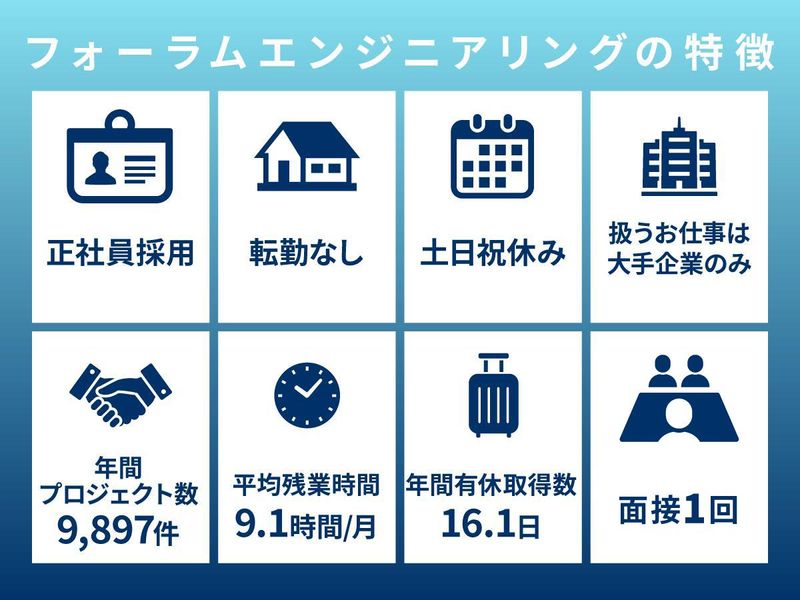 職種/仕事内容 | 仕事内容 ■―――――――――――――■ 面接1回のスピード選考実施中! 3月入社大歓迎! ■―――――――――――――■ ◆経験者月給35万円~ ◆月平均残業時間9.1h ◆入社後も転勤なし 【業務内容】 製造工程変更時の品質管理業務 品質監査、取引先品質指導 報告書作成 【正社員(無期雇用派遣)・賞与あり】 当社の正社員として入社いただいたうえで、大手メーカーをはじめとするプロジェクトに従事していただきます。 一般的な登録型派遣とは異なり、「正社員型派遣」となるため、雇用期間に期限はありません。 派遣期間以外でも給与は保障されますし、賞与も支給されます。 <こんな方にも無期雇用派遣がお勧めです> ・様々な製品に携わりながらエンジニアスキルを向上させたい ・柔軟にエンジニアキャリアを形成したい ・将来を見据えてエンジニアとしてできる幅を広げていきたい ・安定して正社員で働きたいが、職場環境が合うか不安 ・一つの企業に縛られることなく、色々な会社で働いてみたい ※週5日勤務/実働8時間での募集となります。 【フォーラムエンジニアリングの魅力】 ■平均有休取得日数16.1日/年 推しのライブ・旅行・平日のレジャーなど、 趣味や家族との時間を充実させている社員も多数! ■ 土日休み・平均残業時間9.1h/月 完全週休2日(土日祝休み)で、残業も少なめ、 プライベートの時間も確保できる環境です。 ■ 転籍実績:年間100名以上 プロジェクト先の大手メーカーへ正社員として転籍するチャンスも多数あります。 ■ 年間プロジェクト数:9,897件 業界最大級の案件数の中から、あなたに最適なプロジェクトをご紹介します。 キャリアや希望に関するご相談もお気軽にどうぞ! ■ 入社後も転勤なし 好きな場所、馴染みのある土地で、長く安心して働けます。 |