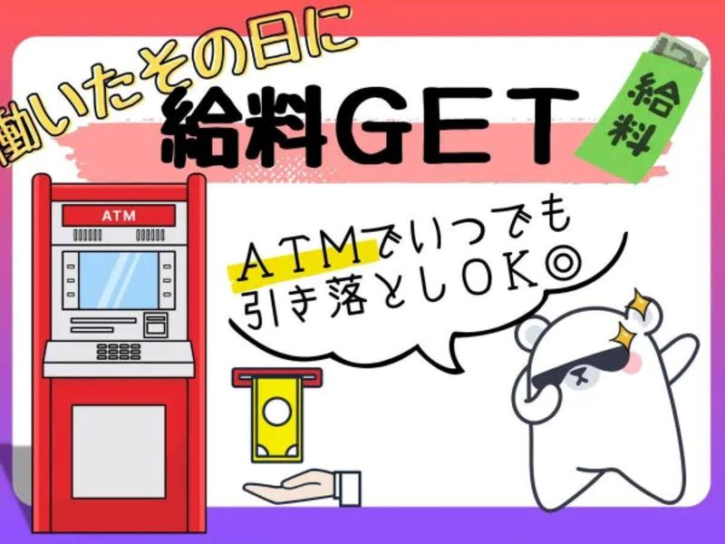 給与 | 時給1,400円 給与詳細 基本給:時給 1400円 +交通費支給 ★交通費一部支給 ┗1日500円を超えた分は全額支給! ※往復500円以内の方は自己負担となります ★日払いOK!(規定あり) ┗働いたその日に現金GET♪ お仕事後はコンビニATMから 日払い分を引き落とせます! |