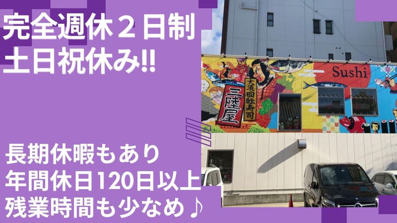 休日休暇 | 休日休暇 完全週休2日制(土日) 祝日、GW、夏季休暇、年末年始、 有給休暇、慶弔休暇 ※年間休日120日以上 |