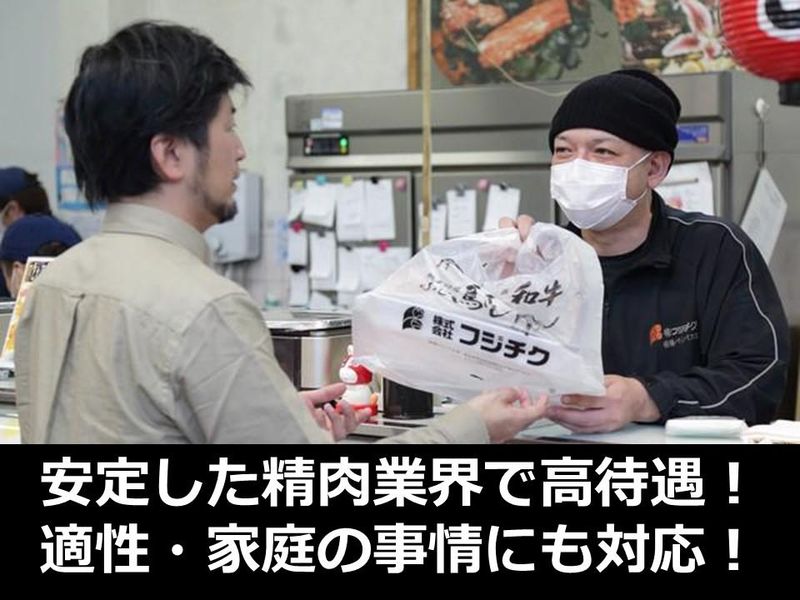 職種/仕事内容 | 仕事内容 ╭━━━━━━━━━━━━━━━━━╮ ✨アピールポイント✨ ✅給与24万495円~スタート!! ✅賞与あり◎年2回支給(7月·12月) ✅社割でお肉20%OFF! ✅退職金制度もございます! ✅希望休(土日祝)もとれる! ╰━━━━━━━━━━━━━━━━━╯ ****************************** 仕事内容 ****************************** 主にお任せするのは、 お肉の加工や販売業務です。 店舗での業務となりますので、 お客様の多い土日祝に勤務できる方の 募集をしています。 ご家庭の事情によってスタッフで調整しながら 土日祝の希望休も取得できます! ▼具体的には… ・店頭での接客 ・在庫管理(店舗商品及び資材) ・お肉のカット作業 (カットするのは工場で加工された 10~20キロ程度のお肉です) ・お肉のパック詰めや計量 …といった作業をお任せします。 ⭐基本的に一人ひとりの適性を考慮し 仕事をお任せしていきます! 接客が得意な方歓迎! 例)接客が得意な方は店頭業務メイン 得意でない方は裏方業務メイン ****************************** この仕事のメリット ****************************** ✨未経験から始めたスタッフが多数! ▶現在働く20代~60代のスタッフも 皆さん未経験から始めています。 安心して活躍できる環境です◎ 女性の多い職場です。 ✨長く働ける業界なので、安心◎ ▶ニーズが絶えない業界なので、 景気にも左右されにくく、 安定性もバッチリです。 ✨働きやすい環境を整えています! ▶お休みは月に7日~9日◎ 賞与も年2回あるなど、 スタッフが私生活を大切にできる 環境を整えるだけでなく、 普段の頑張りを給与でも しっかりと還元しています。 ✨お得で嬉しい社割もご用意!! ▶20%オフでお肉を購入できる 社割もございますよ♪ ※採用後、バイパス店または本店の どちらかに配属となります。 ****************************** 当社の仕事へのこだわりについて ****************************** ただお肉を切り分けて売っている。 というイメージがお肉屋さんに あるかもしれません。 ですがそれだけじゃないんです。 例えば… 家庭向きには使いやすい サイズに切り分けたり、 焼肉店向きには珍しい部位を 仕入れて販売するなど、 ニーズごとに合った お肉の提供を行っています。 もちろん切り方だって 部位や用途により違うなど、 そんな奥深さをここで 知ってくれたら嬉しいです。 ****************************** 安定した業界で働ける! ****************************** 食生活に欠かせないお肉業界! ニーズが途絶える心配もないので 業界も安定しています。 現在お取引先は飲食店・焼き肉店 だけでなく、スーパー・精肉店など 様々なお店とお取引を行っています。 その他にも直営店舗やオンラインでの 販売も行っているので、 景気にも左右されにくく、業績も安定。 私たちが生きていくなかで 欠かせないお肉。 それを届けるお仕事です。 ****************************** 当社について ****************************** 地域に密着し、1982年に創業しました。 現在では牛4000頭、馬1000頭を飼育し、 馬肉、黒毛和牛の飼育、加工、販売まで 一貫して手掛けています。 ”ふじ馬刺し” ”藤彩牛” というブランド肉も 熊本県内外で好評を得ています。 現在業績も右肩上がりで伸びており 企業として注目していただいています。 スーパーや食肉工場のほか 飲食店などへの卸の実績があります。 当社の強みはなんといっても 「品質の良さ」にあります。 ・自社加工工場での最新鋭の設備導入 ・衛生的かつ迅速な食肉加工 ・独自の販売ルートによる卸し売り ・直営店舗、オンラインショップでの販売 …といった、これまで培ったノウハウを 活かし、自慢のお肉を 沢山の方の元へお届けしています。 |
