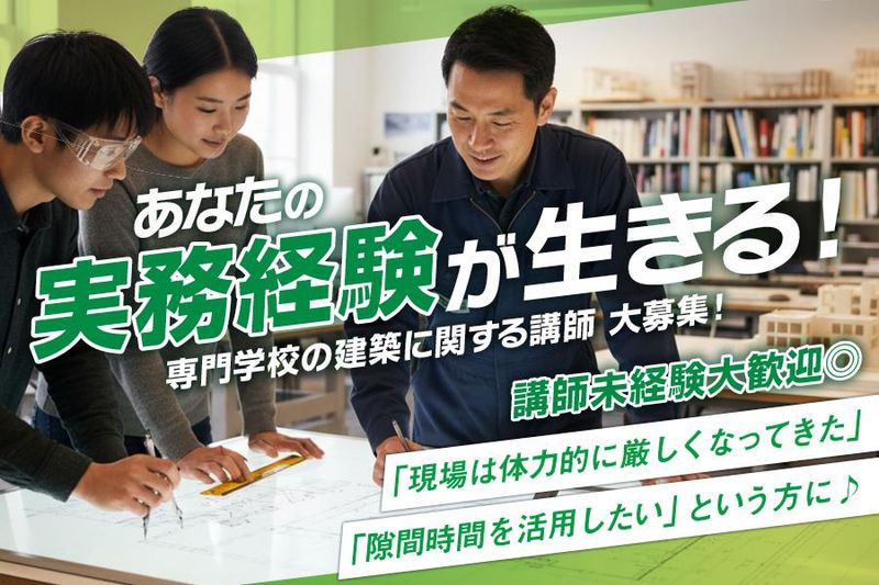 職種/仕事内容 | 仕事内容 建築学科の専門授業を担当(実習授業等)できる方 学生の指導にあたることができる方を大募集! ・これまでの経験を活かした仕事を探している方 大大大歓迎です♪ ⭐⭐お仕事の内容⭐⭐ お持ちの経験や知識を発揮し、 「建築業界にて活躍したい!」と 夢を持つ学生を指導してください。 建築計画・建築法規・建築構造・建築施工 積算・設計演習・CAD・建築デザインなど、 授業の基本カリキュラムは決まっているので、 教科書に沿って実習や講義を行っていただきます。 科目指導の他、 学生管理業務もお願いします。 講師未経験からスタートした方も多数在籍しており、 講師経験がなくても安心して働ける環境です! ⭐⭐勤務時間⭐⭐ ・8:40~17:00(休憩50分) ////////////////////////////////////// ✅こんな方におすすめ 建築業界を志す学生に、 建築の面白さや知識技術を教える やりがいのある仕事です! これまでのキャリアを活かして 働きたい方大歓迎です◎ ・実務経験や知識を活用したい方 ・「現場は体力的に厳しくなってきた‥」という方 ・定年後の隙間時間を有効活用したい方 ・Wワークもご相談ください! ////////////////////////////////////// ⭐⭐こんな方を歓迎します⭐⭐ <必須資格> ■1級建築士の有資格者 ■大学・短大・専門学校以上 ※講師・教師の経験や教員免許は不要です。 ⭐⭐職場の雰囲気⭐⭐ ・穏やかで落ち着いた キャンパス内でのお仕事です ・職員同士は優しく協力し合い、 安心して働ける雰囲気です^^* |
