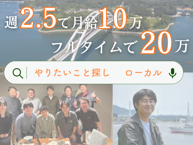給与 | 月給100,000円~200,000円 給与詳細 基本給:月給 10万円 〜 20万円 固定残業代:なし 【一律手当】 全員に一律で支払われる通勤・皆勤・家族手当金額:なし 全員に一律で支払われるその他手当金額:なし 月給:10万円〜20万(月80時間以上) ※月最大160時間(月給20万円の幅まで毎月勤務調整が可能です) ✨1-2ヶ月目:【月160時間:20万円】最初は月160時間で地域と職場に慣れていく! ✨3-4ヶ月目:【月120時間:15万円】生活も安定してきたので、自分のビジネスを模索 →メンタリングや壁打ちなどもお手伝いできる環境あり! ✨5-6ヶ月目:【月80時間:10万円】残りの月80時間は自分のビジネスに! 雇用形態:短時間正社員 勤務地:宮城県気仙沼市および近隣企業 週2.5〜3日はジョイントワークス業務/残りは自由に活用可能 使用ツール:Googleドキュメント、Googleスプレッドシート、Messenger |