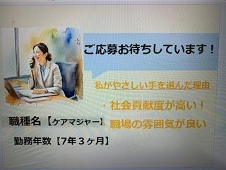 職種/仕事内容 | 仕事内容 \年間休日124日/ \有給取得日数 平均9.6日/ \産前産後休業 取得→実績あり/ \育児休業 →取得実績あり・復帰率96%/ 【安心のサポート体制】 訪問先でトラブルがあってもすぐに電話で相談できます ・ご利用者宅へ訪問(新規契約訪問・定期訪問・サービス担当者会議・モニタリング) ・居宅サービス計画書(ケアプランの作成)~PDCAサイクルの実施 ・介護保険の給付管理・介護認定調査 ・介護相談 《よくある質問》 Q.いくつまで働けるの? A.正社員としては61歳の誕生日まで、となっていますが、それ以降は1年ごとに契約を更新する契約社員や曜日や時間を自由に設定できる非常勤という働き方ができます。 今やさしい手では、20代から70代までのケアマネジャーがたくさん活躍しています。 Q.土日や夜間も呼び出されるの? A.特定事業所Ⅱのため、事業所で一台 緊急連絡用の携帯電話を用意しています。緊急電話は事業所内で職員が1週間ずつ持ち回りで担当します。土日や夜間の電話自体ほとんどなく、担当ケアマネジャーが呼び出されるということはほぼありません。(これまでの実績としてもナシ) Q.土日は休めるの? A.変形労働制を採っておりますが、基本的に土日祝がお休みです。まれにご利用者の都合で、初回契約のみ土日祝で対応することがあります。この場合代休が取れますので、休日が減ることはありません。 |