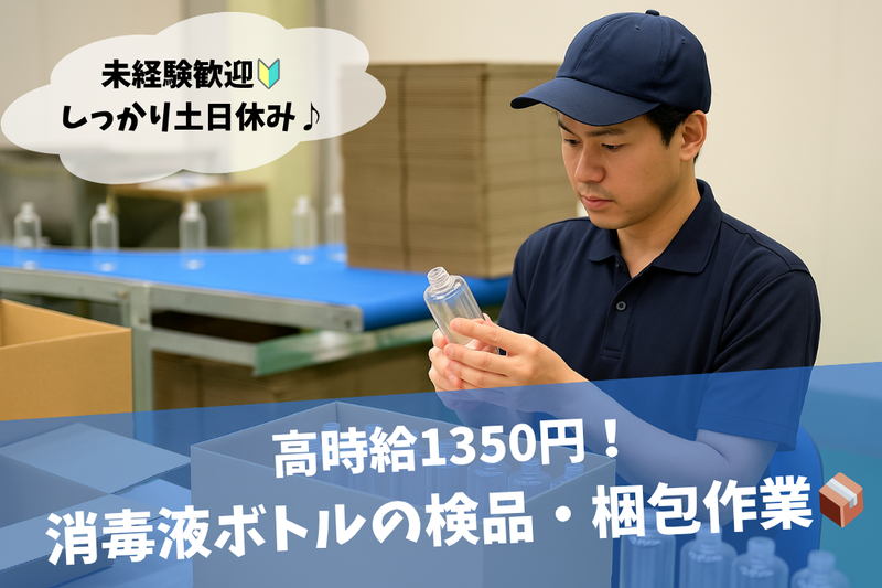 職種/仕事内容 | 仕事の内容 \✨未経験OK!消毒液ボトルの検品・梱包作業✨/ 「見る」「包む」「箱に入れる」だけの簡単軽作業! 身近なプラスチック製品を扱うお仕事なので、イメージしやすいです。 マニュアル完備&先輩のサポートがあるので、未経験の方も安心してスタートできます。 【お仕事内容】 ・流れてきた消毒液ボトルや日用品に、キズや汚れがないかチェック ・問題がなければ、袋詰めや箱詰め作業 ・チェック表への簡単な記入 ・作業場の片付け、清掃など 【✨ココが魅力!✨】 ✅高時給1350円スタート!しっかり稼げます ✅週払いOK!急な出費も安心 ✅車・バイク・自転車通勤OK!無料駐車場完備 ✅交通費支給あり(規定あり) ✅土日祝休み!年間休日120日!大型連休あり ✅社会保険完備 ✅友達同士の応募OK! ✅ロッカー・休憩スペース完備 ✅未経験スタートのスタッフ多数活躍中 【こんな方におすすめ】 ・未経験から軽作業に挑戦したい方 ・コツコツと集中して作業するのが好きな方 ・力仕事が苦手な方 ・プライベートの時間も大切にしたい方 ・友達と一緒に働きたい方 |