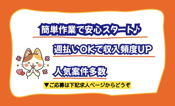 職種/仕事内容 | 仕事内容 \応募理由は「家が近かったから」でもOK!/ *・。 お仕事のポイント 。・* ◆誰でもできるカンタン作業! ◆指示されたことを忠実にこなせればOK! ◆家族、趣味、仕事終わりのビール1杯…『このために仕事を頑張りたい!』とお思いの方も歓迎〇 * 最短3日後に勤務スタート可 * まさに今が稼ぎどき!貴重な20~30代! \1日も無駄にしないでください/  ̄ ̄ ̄ ̄ ̄ ̄ ̄ ̄ ̄ ̄ 【 仕事内容 】 医薬用などで使用されるプラスチック製品を製造する企業様でのお仕事です。 <具体的には…> 機械から出てきた製品を検品 →検品した製品を梱包するだけ! カンタンな軽作業です☆ *クリーンルームでの立ち作業です。 *検査作業では視力が必要です。  ̄ ̄ ̄ ̄ ̄ ̄ ̄ ̄ ̄ ̄ ̄ ̄ ̄ 【* おすすめPOINT *】 ■夜勤でしっかり稼げるお仕事! ■研修期間(2~4週間)は日勤勤務 ※9時~16時勤務(実働6時間15分) ■40代前半までの女性が活躍中!  ̄ ̄ ̄ ̄ ̄ ̄ ̄ ̄ ̄ ̄ ̄ ̄ ̄ ̄ ̄ ̄ ̄ 【* スタッフさんコメント *】 「未経験でも大丈夫でした!丁寧に教えてもらえるから、すぐに慣れて安心です。」 「覚えることが少なくて、作業もシンプル。あっという間にコツがつかめました!」 「効率的に稼ぐことができています!」 【 充実の福利厚生! 】  ̄ ̄ ̄ ̄ ̄ ̄ ̄ ̄ ̄ ̄ ̄ ̄ ̄ ◆永年勤続表彰制度 勤続年数による手当があります。 例)勤続年数10年:3万円の手当と記念品 勤続年数20年:5万円の手当と記念品、エクシブ招待 腰を据えて長く働きたい方にとって、大変魅力的な制度です! 頑張りにしっかりリターンを返します。 安定したキャリアを築いて、一緒に成長しましょう! その他にも、家族手当や仮払い(週払い)制度など 働きやすい環境を整えてお待ちしております◎ |