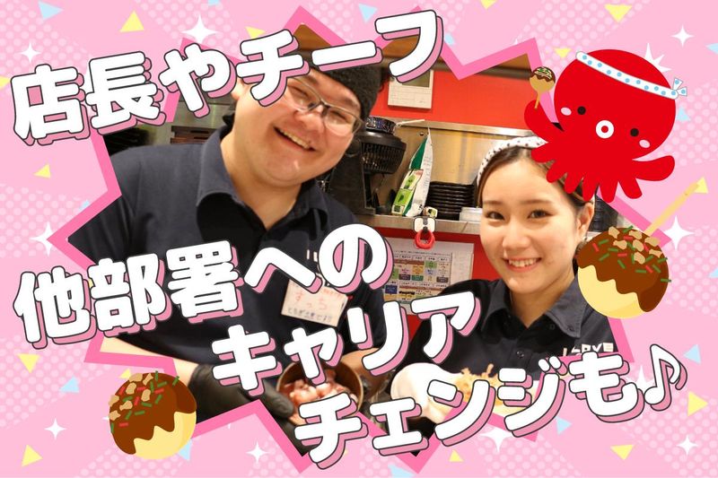 職種/仕事内容 | 仕事内容 <仕事内容> ・オーダー取り ・配膳 ・食事後のかたづけ ・お会計 ・おつまみの盛り付け ・ドリンクづくり ・たこ焼きのトッピング など まずはオーダー取りや配膳などの簡単な接客からスタート! 順番に教えていくので、未経験でも心配しなくて大丈夫◎ たこ焼き鉄板を使った焼き業務にも挑戦していただきます! <福利厚生充実!> ・月9日休みのシフト制で プライベートも充実! ・チーフや店長へキャリアアップ可能! 他部署へのキャリアチェンジも◎ ・年2回の昇給、賞与で頑張りをしっかり反映! ・手当や休暇制度も充実しています♪ <安心の研修制度で未経験も大歓迎!> 入社後は座学や実務研修で独り立ちまで安心サポート♪ 講演会への参加など、スキルアップできる機会もたくさん! <お店の魅力はスタッフみんなが仲良し> 分け隔てなく話せる環境なので、 お客様もスタッフも居心地が良いお店です♪ |