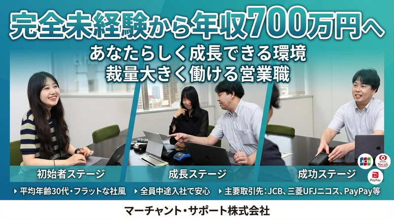 職種/仕事内容 | 仕事内容 ★未経験スタート歓迎★ 定着率95%の理由があります 【テレアポ経験不要】あなたに合った営業スタイルで活躍できる キャッシュレス決済コンサルティング営業 \ こんな方にピッタリ! / ✓ 営業未経験だけど、人と話すのは好き ✓ 安定企業で長く働きたい ✓ ノルマに追われるのは嫌 ✓ 自分のペースで成長したい ✓ 将来的に年収アップを目指したい → そんなあなたを全力でサポートする環境が整っています! 【会社の魅力】 ◎急激に成長しているキャッシュレス業界 ◎当社は設立から20年以上キャッシュレス決済の提案を続け、様々なノウハウを積み上げて、業界に貢献しています ◎オープンで社歴や年次に関係なく、裁量大きく業務を任される! ◎充実な福利厚生 ◎全員中途入社者、去年実績の定着率なんと95%! 【業務内容】 提案先は街の飲食店や美容室などお買い物シーンが思い浮かぶ先!オーナーさんと直接話す機会も多く、 色々なお話を聞けるので楽しみながら仕事している人が多くいます。 好きな業界を中心にアプローチするのもOK!楽しく仕事しちゃいましょう! 【業務の流れ】 ◆新規のご案内電話でのアプローチが多いですが、手段は問いません。 ご自身が得意とする効率の良い方法を模索してみてください。 ◆商談 商談とは言いますが、契約をいただく先のほとんどが最初のアプローチ時点(電話)で条件面の擦り合わせまで終わっているケースが多いです。 商談というよりも顔を見せて最終的に信用していただくための説明アポイントという位置付けです。 ☆ここがオーナーさんに色々お話を聞いて仲良くなるポイント箇所です♪ もちろん電話だけで申込をいただくケースも多くあります。 ◆契約 \仕事のPOINT!/ ◎01:未経験歓迎! 営業も業界も未経験から活躍している社員が多数。研修・育成体制も充実しています。 ◎02:提案しやすい商材 手数料の優位性があり、話を聞いてもらいやすい決済サービス。お客様から「コスト削減できた!」と喜ばれることも。 ◎03:進化するキャッシュレスを提案 技術者と連携し、顧客ニーズに合わせたカスタマイズ提案も可能。大手チェーン導入実績あり。 【入社後の流れ】 ◆座学研修 まずは、クレジット業界や決済の仕組みなど、業務に必要な基本の知識を学んでいただきます。 ◆OJT研修 最初は常に先輩社員が近くにいる状況です。何も不安がることはありません。困ったらすぐに頼っちゃいましょう。 先輩社員の訪問同行や逆に自分の案件先へ先輩に同行してもらうなど、段階を踏んでステップアップしていきましょう。 ◆自分なりの営業手法を確立しよう! 当社はアプローチ手法を限定していません。コンプライアンスの範囲内で一緒に模索しながら確立していきましょう^^ チーム組織構成 現在セールス担当は6名体制。 全員が中途入社で、異業種からの入社も多数! 年功序列のないフラットな社風が特長で、意見発信や相談がしやすい環境です。 【主要取引先(一部)】 株式会社ジェーシービー 三菱UFJニコス株式会社 トヨタファイナンス株式会社 NTTドコモ(d払い)/PayPay株式会社/LINE Pay株式会社/楽天ペイメント株式会社 GMOペイメントゲートウェイ株式会社 テンセントグループ/アリペイグループ/銀聯国際 |