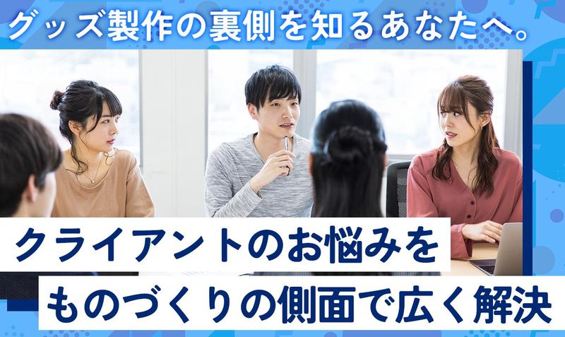 対象となる方 | 求めている人材 ◎学歴不問 ◎営業未経験歓迎 【必須条件】 □グッズ製作にかかわった経験をお持ちの方 または、 □グッズ製作に関わる基本的な工程を 理解している方 ※アーティスト、アニメ、スポーツ、 企業ノベルティなどジャンル不問 ━・━・━・━・━・━・━・━・━ 【営業経験は不問です!】 営業のスキルは入社後に習得可能です。 むしろ、製造工程や素材特性を 理解した上での提案が求められるため、 「生産背景をわかったうえで 企画を考えられる人」に最適な環境です! クライアントの課題を理解し、 モノづくりのプロとして最適な解決策を 提案できる方をお待ちしています。 ━・━・━・━・━・━・━・━・━・━ 【活かせる前職】 ・映像制作 ・WEB制作 ・制作進行 ・タレントマネジメント ・グラフィックデザイナー ・グッズデザイナー ・フィギュア造形師 ・グッズ製作のプランナー ・プロダクトデザイナー ・MD(マーチャンダイザー) ・グッズ製造 ・プリントオペレーター など ━・━・━・━・━・━・━・━・━・━ <<メンバーについて>> 企画営業に携わっているのは、 男性7名、女性5名の合計12名。 全員が中途入社です。 30代の社員が多く、平均勤続年数は5年程度。 中には10年目の女性社員もいます! 各々の案件も協力して業務を進めており、 困ったときは相談し合うなど チームワークもバッチリ! 同業他社から転職してきた メンバーの定着率も高いのが特徴です! 社員は18名で23歳から50歳までと 幅広い年代の社員が活躍しています! |
