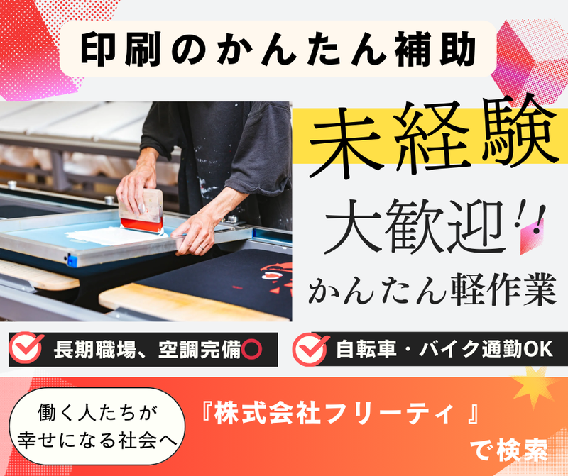 職種/仕事内容 | 仕事内容 ✨有名なスポーツメーカーの商品制作に携わるお仕事✨ 印刷作業のかんたんなサポートをおまかせします! 具体的には↓ ✅ インクなどの資材の準備や後片付け ✅ 印刷作業の補助 ✅ 完成品のチェックなど 難しい作業は社員が担当します! 未経験の方も安心してスタートできる作業のみ♪ ※インクの匂いに抵抗のない方 |