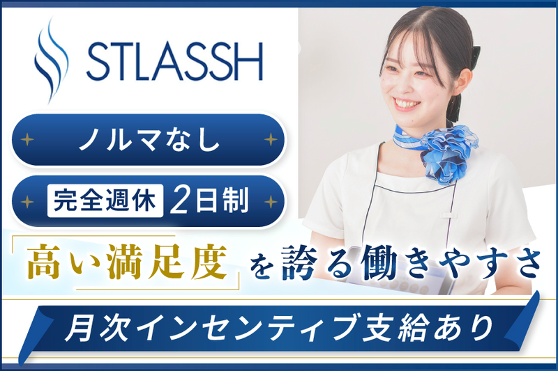 職種/仕事内容 | 仕事内容 ~・~・~・~・~・~・~・~・~・~ 女性専用脱毛サロン 『STLASSH (ストラッシュ)』のお仕事♪ 未経験から美容のお仕事デビュー✧ ~・~・~・~・~・~・~・~・~・~ 「美容が好き」 「自分磨きも楽しみながら働きたい」 そんな方にぴったりのお仕事です♪ \この求人のPOINT/ ✨土日祝休み・連休取得OK! ✨ネイル・ヘアカラーOK! ✨20代・30代メイン!同世代が多くて安心♪ ✨残業少なめで予定が立てやすい◎ ✨全身脱毛が無料で受け放題! \働き方を選べる限定ポジション/ 本店舗の採用では、状況に合わせて 勤務スタイルを「希望の場所での勤務」 に合わせることが可能◎ 地域採用を選択すると・・・ ライフイベントやI・Uターンなど 状況に合わせて長く働き続けることができます。 - - - - - - - - - - - - - - - - - ❤お仕事内容❤ - - - - - - - - - - - - - - - - - 女性専用の美容脱毛サロン 『STLASSH(ストラッシュ)』にて、 受付・接客業務をお任せします。 ・受付・ご案内業務 ・カウンセリング ・施術お手入れ ・店内清掃、カルテ管理など まずはご予約されお客様の受付業務から カウンセリング業務をお任せ。 慣れ出来たら施術お手入れ業務も 徐々にお任せいたします! \未経験でも安心の理由/ 未経験入社が8割のため、 基礎からしっかり学べる 研修をご用意しています! ✅実技研修 脱毛施術・脱毛マシンの使い方 ✅座学研修 脱毛の基礎知識・接客マナー・カウンセリング方法 先輩スタッフもしっかりサポートするので 安心してスタートできます♪ - - - - - - - - - - - - - - - - - ❤働きやすさのポイント❤ - - - - - - - - - - - - - - - - - ✨完全週休2日制&年間休日115日 プライベートの時間もしっかり確保! 友達との予定や推し活、 旅行なども楽しめます♪ ✨頑張りはしっかり評価 インセンティブ制度があり、 月収アップも目指せます◎ ✨ノルマ・クレーム対応なし 数字に追われることはなく、 お客様にしっかり向き合える環境です! ストレス少なく働けるのも魅力のひとつ♪ ✨広告モデルに挑戦できる機会も!? SNSや広告などのモデルとして 活躍できるチャンスもあります! (希望者のみです♪) - - - - - - - - - - - - - - - - - ❤当社について❤ - - - - - - - - - - - - - - - - - 美容脱毛業界第3位の大手グループ! 全国に店舗を展開しており、 現在も新店舗オープンが続くなど 成長を続けているサロンブランドです♪ 脱毛だけでなく、 複数の美容事業を展開しているため 安定した経営基盤があることも特徴です◎ |