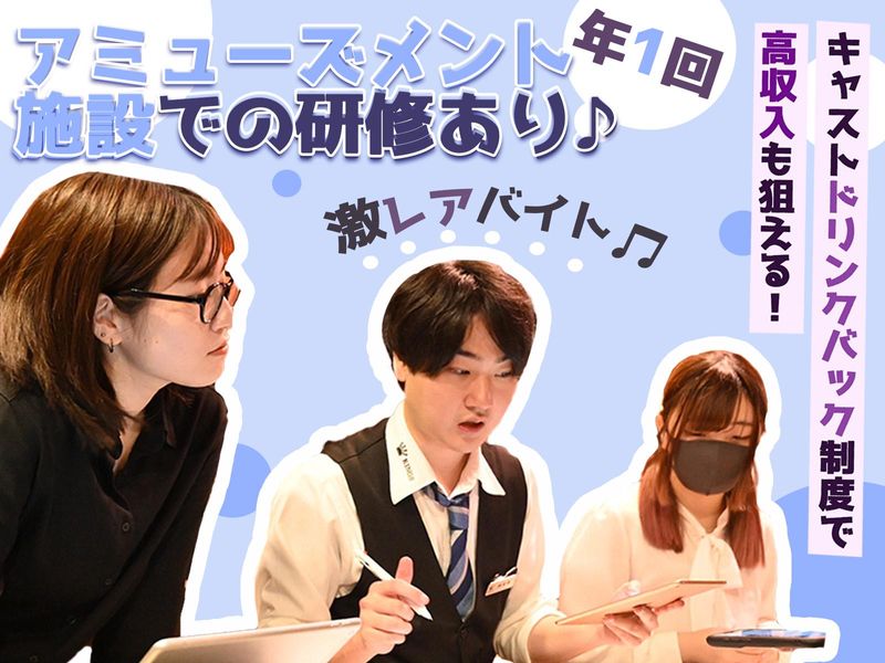 待遇・福利厚生 | 【保険制度】 雇用保険、労災保険、健康保険、厚生年金 【福利厚生】 待遇・福利厚生 【福利厚生】 ✨年1回アミューズメント施設での研修 KINGS では“研修イベント”を開催。 世界最高峰のアミューズメント施設で 接客のヒントやエンタメの空気感を 体感できます。 スタッフ同士の仲も深まる 大人気のイベントです◎ ■交通費全額支給 ■昇給あり ■アミューズメント施設での研修 ■キャストドリンクバック制度 ■従業員割引制度 ■研修制度 ■個人専用ロッカー完備(カギ付き) ■トイレ男女別 ■髪型・髪色・ネイル自由 ■制服貸与 ■社会保険は法令に準ずる |