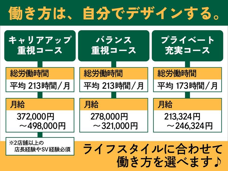 給与 | 月給278,000円~321,000円 給与詳細 ※基本給・固定残業代の総額 基本給:月給 21万3324円 〜 24万6324円 固定残業代:あり 1ヶ月あたり6万4676円 〜 7万4676円(固定残業時間:1ヶ月あたり40時間) 固定残業時間を超えた勤務時間については別途残業代を支給する 【一律手当】 全員に一律で支払われる通勤・皆勤・家族手当金額:なし 全員に一律で支払われるその他手当金額:なし ★前職給与はしっかり考慮! 経験・スキルに応じて月給をご提案します。 ★業績賞与あり ★交通費全額支給 【選べる働き方】 ✅キャリアアップ重視コース 総労働時間平均213時間/月 月給372,000円~498,000円 ※2店舗以上の店長経験やSV経験必須 10,676円~14,176円のみなし深夜含む ✅バランス重視コース 総労働時間平均213時間/月 月給278,000円~321,000円 61,448円~70,594円のみなし残業、 3,228円~3,722円のみなし深夜含む ✅プライベート充実コース 総労働時間平均173時間/月 月給213,324円~246,324円 【給与例】 給与例 ★年収例 年収650万円(月給42万円+役職手当+賞与)※入社3年目/店長 年収400万円(月給28万円+賞与)※入社1年目/店長候補 |