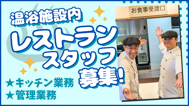 職種/仕事内容 | 仕事内容 「美・健康・癒し」をテーマに、 天然温泉、サウナ、ボディケア、食事を通して 地域のお客様に癒しの空間と集いの場を ご提供しているスーパー銭湯型温浴施設 「湯舞音(ゆぶね)」にてスタッフを募集‼ 今回はレストランスタッフとして 【キッチン業務】 お食事・ドリンクの調理、提供 【管理対応】 スタッフ採用、育成 仕入れなど食材・原価管理 メニュー開発やPOP作成 など 全体の管理業務をお任せします。 入社後3ヶ月はOJT研修があるため 未経験の方も安心して始められます◎ === ★ココで働くメリット  ̄V ̄ ̄ ̄ ̄ ̄ ̄ ̄ ̄ ̄ ̄ ・安定した顧客層 ・独特の雰囲気とコンセプト ・地域密着型ビジネス ・リラックスした顧客対応 ・施設のブランディングへの貢献 自己成長と大きなやりがいを感じられるお仕事です。 |