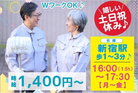 職種/仕事内容 | 仕事内容 <安心の住友不動産特約店> キレイな住友オフィスビル内! \オフィス内の軽清掃/ 未経験大歓迎♪親切指導で安心♪ 30代~72歳/男女活躍中 ◆時給UP1400円!土日祝休み 【勤務地】新宿区西新宿3丁目 京王線・小田急線・都営大江戸線「新宿駅」ルミネ口徒歩3分又は都営新宿線・京王新線「新宿駅」徒歩1分、都営大江戸線「都庁前駅」徒歩6分 【具体的には】 テナント事務所内の ・簡単な掃除機掛け ・ゴミ回収など 【勤務時間・曜日】 16:00~17:30/1.5h ★月~金曜/週5日(祝休) (Wワークも大歓迎) 【休日・休暇】 完全週休2日(土・日・祝日) GW・年末年始休暇あり ★年間休日120日以上♪ ✅難しい作業はなし♪ ✅トイレや水回り清掃なし♪ ✅ビル内/冷暖完備で通年快適 - 選ぶなら全国展開で躍進する 安定成長企業 株式会社コアズへ! - |