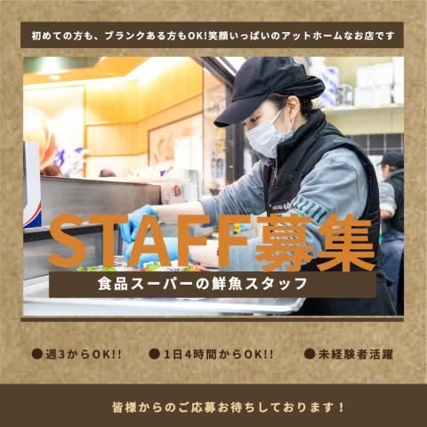 職種/仕事内容 | 募集要項 職種 食品スーパーの鮮魚(品出し)スタッフ 雇用形態 パート 仕事内容 鮮魚の加工・調理、盛り付け、パック詰め、値付け、品出し、接客など 【具体的には】 その日の売れ行きに合わせて魚の盛り付けやパック詰め、 その他品出しや接客を行なっていただきます。 <小学生から師匠と呼ばれる日> 「日本一楽しいスーパー」を目指す当社では お客様から喜ばれる事はどんどんやってOK! 毎日来る小学生に魚の事を色々教えているうちに「師匠」と 呼ばれるようになりました。 毎日同じ魚をカットするわけでもなく自分では買って食べた事がないような 変わり種商品の仕入れもあるので毎日新鮮な気持ちで働いていただけます。 今いるスタッフも初めは短期や単発でのアルバイトを探していたけど、 長期的に働いてくれているほど毎日新鮮な気持ちで働ける環境です。 未経験から始めた先輩がたくさんいて一緒にサポートしますので未経験の方も ご安心ください。 |