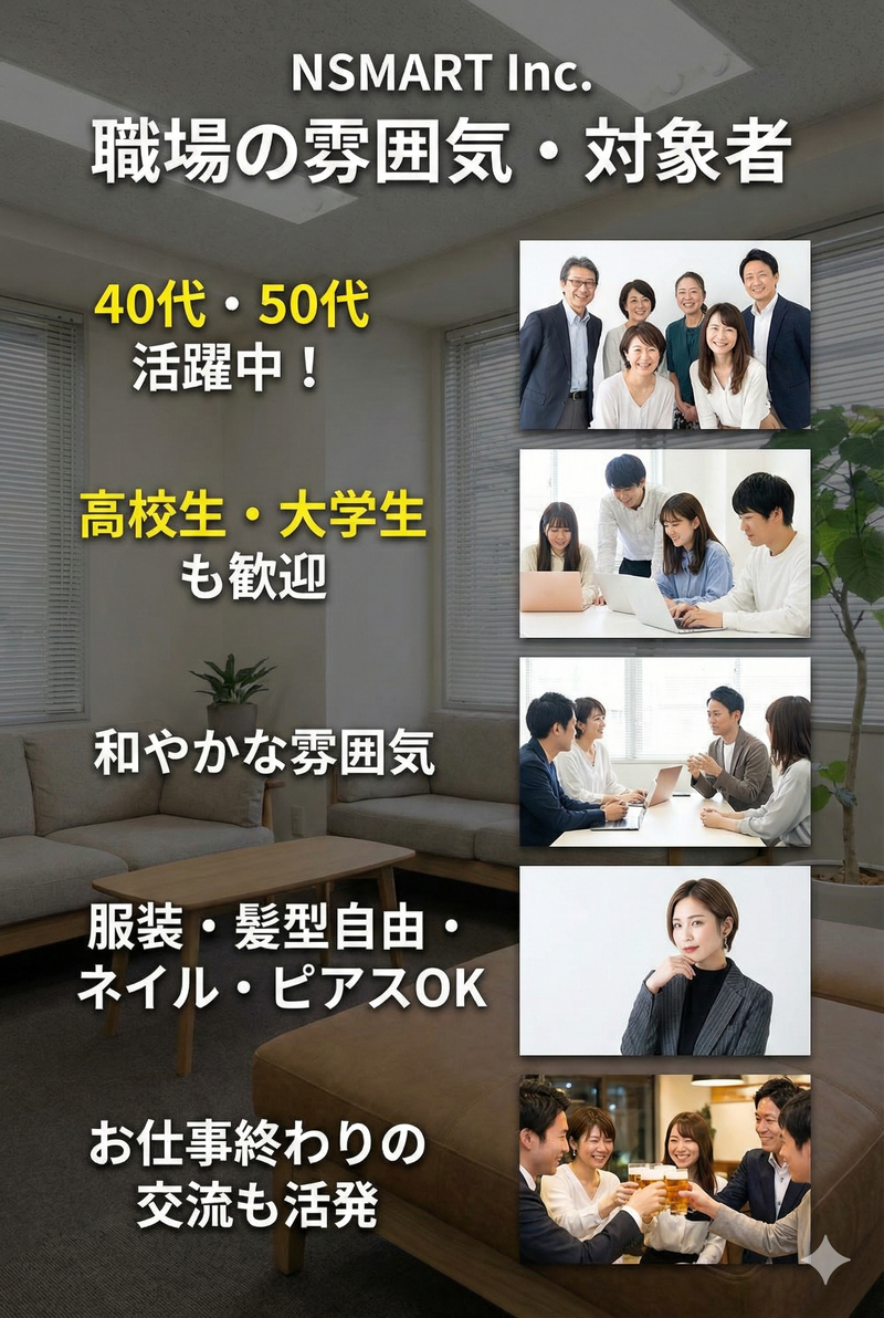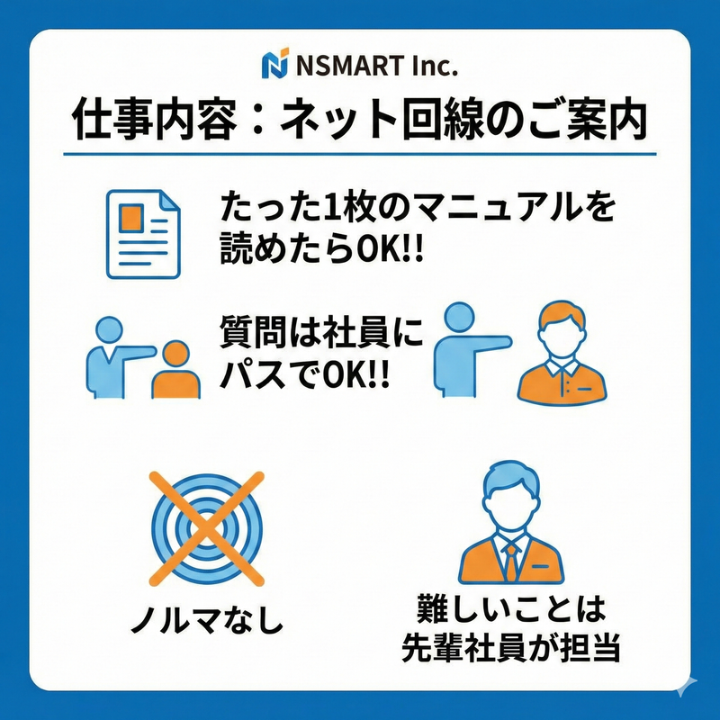 対象となる方 | 求めている人材 ~1枚のマニュアルでできる理由~ 他のコールセンターの会社さんでは 聞かないといけないことが、 多いのでマニュアルも 3枚・4枚必要になります。 弊社のお仕事は 「興味があるかないか」を 聞くだけなので、 1人に対する時間も 5分でできちゃいます♪ 社員のスタッフが必ず数名在中しているため、 分からないことや困ったことがあったら、 すぐにフォローするので安心です。 安定感もあり長く続けたい方にもピッタリ。 ◎基本、台本通りに読むだけ! 難しいお仕事はありません♪ <インセンティブあり!> 時給に加えてインセンティブもご用意◎ あなたの頑張りはインセンティブとして、 しっかりとお給料に還元するので、 モチベーションを維持したまま働けます! |