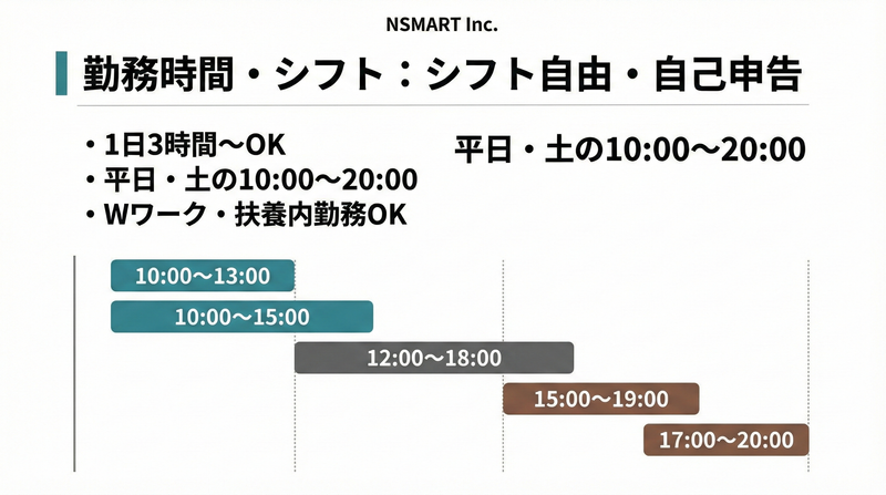 勤務時間 | 変形労働時間制 勤務時間詳細 週3日以上、1日4時間以上で シフト自由・自己申告となります。 午前だけ、午後だけなど時間も自由◎ WワークやフルタイムでガッツリもOK!! 10:00~20:00(実働3~8時間) 週3日~・1日4h~OK *週3~5日でシフト自由 *フルタイムOK *午後から勤務OK *月~土の勤務OK ※日曜日が定休日となります。 契約更新期間:3か月 |