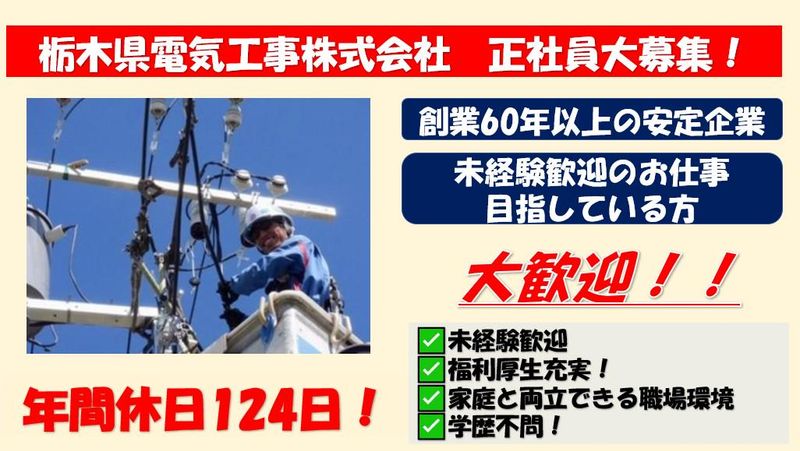 職種/仕事内容 | 仕事内容 【☆主なお仕事内容☆】 高所作業車などを駆使し電柱の 新設や変圧器などの機器の 取付、電線を張るお仕事です。 ★==================★ ✅年休124日♪ ✅資格支援制度充実♪ (取得にかかる費用は会社負担) ✅創業60年以上の安定企業♪ ✅無資格でも手に職をつけられる◎ ✅地元で腰を据えて働ける! ★==================★ 【弊社について】 当社は、東京電力パワーグリッド株式会社様 のパートナー企業。電柱をはじめ、栃木県内 の電気設備の新設・保守を手がけています。 今回は新たに正社員を募集します。 電気工事の資格・経験は不問。 充実の研修設備とサポート体制で ゼロから育てていきます。 必要な資格は全額会社負担で取得可能。 応募前の職場見学も受付中です! お気軽にご相談ください! ◆栃木の電気を支えて60年以上 創業63年を迎えた栃木県電気工事株式会社。 栃木県内全域に事業所を構え、電気の 安定供給を支えています。 具体的な作業内容は、電柱の新設や 変圧器などの機器の取付や 電線の取付など。 東京電力パワーグリッド株式会社様 からの発注なので仕事が 途切れる心配はなし! 継続的に安定収入を得られます。 今回は受注増加に伴う増員募集。 スタッフは明るく優しい人が多いです。 仕事の話はもちろん気さくに世間話 もできる穏やかな職場です。 当社で手に職をつけた人も多数! 「安定して働きたい」「資格をとりたい」など 前向きな気持ちがあれば一人前に育てます。 ✨この求人の特徴・魅力✨ ✅土日休み ✅育休あり ✅年間休日120日以上 ✅完全週休2日制 ✅介護休暇あり ✅賞与あり ✅車通勤Ok ✅資格取得支援あり ✅交通費支給 ✅資格取得手当あり ✅退職金あり ✅研修あり ✅学歴不問 ✅経験不問 ✅業界未経験歓迎 ✅ブランクOK ✅第二新卒歓迎 ✅中途入社50%以上 ✅ノルマなし ✅職場見学可 |