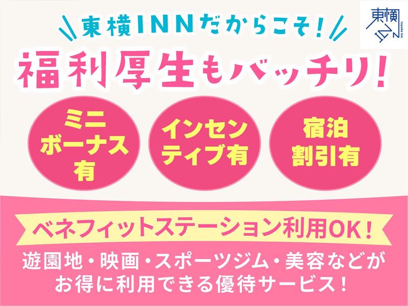 待遇・福利厚生 | 【保険制度】 雇用保険、労災保険、健康保険、厚生年金 【福利厚生】 待遇・福利厚生 【福利厚生】 ◆交通費支給(月5万円迄) ◆自転車通勤の方(2km~)…1日100円支給 ◆昇給有 ◆有給休暇 ◆ミニボーナス ◆制服貸与 ◆東横INN全店割引制度有 ★ベネフィットステーション利用OK! 遊園地・映画・買い物・スポーツジム・美容等など お得に利用できる優待サービス! スタッフ本人だけでなく家族も一緒に使えるのも嬉しい特典♪ |