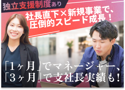 対象となる方 | 求めている人材 ★学歴や経歴は不問! 「仕事に対する前向きな姿勢」や「成長意欲」を重視しているので、営業経験はなくてもOKです! <こんな方は大歓迎> ■営業スキルを磨いて高収入を目指したい方 ■いつか起業や独立を目指している方(独立支援制度が充実) ■長期的なキャリアを築きたい方 ■仲間と切磋琢磨しながら成長したい方 ■事業責任者や経営幹部を目指している方 <営業経験者は「責任者候補」として採用> 営業でご活躍された経験のある方や、マネジメント経験者は 責任者候補としての採用も想定しています! |