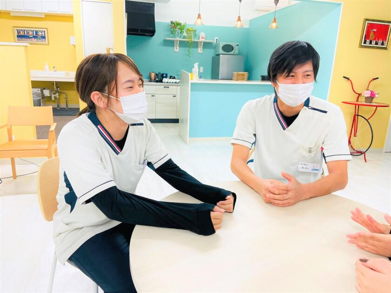 職場環境・雰囲気 | 職場環境 一緒に働くスタッフは7名。 うち、女性が5名、男性2名です◎ 「介護の仕事に挑戦してみたい」 「週休2日で働きたい」 「今より収入を上げたい」 どんな理由でも大歓迎! <活躍中> ⭐ミドル活躍中 ⭐20代~50代の幅広い年代が 活躍しています! 喫煙所:喫煙所あり(屋外) |