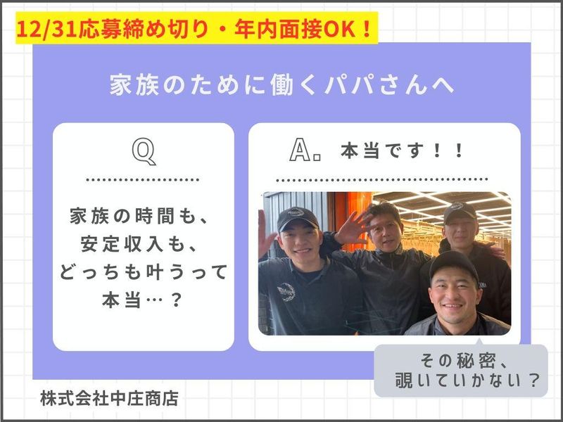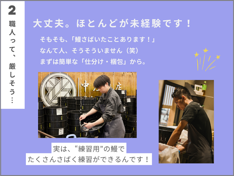 対象となる方 | 求めている人材 \未経験スタート歓迎⭐!/ 学歴不問・経験不問 〈必須条件〉 ・普通自動車運転免許(AT限定可◎) 〈こんな方大歓迎♪〉 ・市場、鰻屋、食品/水産加工業務、建設業など製造業の経験がある方歓迎 ・食品/水産加工(特に鮮魚)に関わったとこがある方 ・正社員として安定して働きたい ・安定、成長している会社で働きたい ・穏やかでアットホームな仲間がそろう職場で働きたい ・ハローワークでお仕事を探している 〈こんな方に向いています✨〉 ・美味しいものが好き!(特にウナギ) ・鮮魚を扱うことに抵抗がない ・魚釣りが趣味 ・魚を捌いた経験がある ・おしゃべりしたり、コミュニケーションをとることが好き 〈こんな業界・職種の方も活躍できます!〉 職人・現場作業スタッフ 製造業(ライン作業)・清掃スタッフ 食品加工スタッフ 飲食店のホール・キッチンスタッフ 店舗販売スタッフ 配送ドライバー・ルートドライバー ■当社について ┈┈┈┈┈┈┈┈┈┈┈┈┈┈┈┈•• 私たち中庄商店は、 天然うなぎ・鮎・マグロ・備長炭・ワインなど、 “本物”にこだわった高級食材を取り扱う専門卸です。 \創業90年以上の老舗企業/ 一流の料理人や料亭、ホテル、専門店など 「本当にいいものを届けたい」プロの方々に、 鮮度と品質にこだわった食材をお届けしています。 その中でも“うなぎ事業”は、 当社の中核を担う部門。 今回はその事業部で、 現場作業スタッフを募集します! 「え、うなぎを触るの!?」と驚かれることもありますが、 実は未経験スタートの先輩ばかり! 丁寧な研修と、あたたかいチームワークでお迎えします◎ 〈現場を見守る本部長にインタビュー!〉 ■「もっと働きやすい職場にするため、 今も改善を続けています」  ̄ ̄ ̄ ̄ ̄ ̄ ̄ ̄ ̄ ̄ ̄ ̄ ̄ ̄ ̄ ̄ ̄ 「“職人の仕事”って聞くと、 正直ハードルが高く感じるかもしれません。 でも実際は、未経験からスタートした方ばかり。 だからこそ、安心して飛び込んできてほしいと思っています。」 そう話すのは、現場を統括する本部長。 実は今回の募集も、 「もっと働きやすい職場にしたい」という 想いからスタートしたといいます。 \働き方の“改善”も進行中/ ✅昔は3時~18時の通し勤務の時代もありましたが → 今は【3時〜12時/8時〜17時】の分業制へ ※今回の募集は【8時~17時】となります。 ✅家族を大切にしたい海外スタッフも活躍中! └実家に帰国するために 2〜3週間のお休みを取った方も! 「新しい仲間が入ってくれることで、 今いるメンバーも、もっと休みが取りやすくなります。 働き方をさらに見直していく予定ですので、 “家族との時間”や“自分の時間”も、 しっかり大切にしてほしいですね。」 (本部長) |
