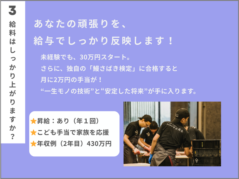 給与 | 月給301,110円 給与詳細 ※基本給・固定残業代の総額 基本給:月給 22万6455円 固定残業代:あり 1ヶ月あたり7万4655円(固定残業時間:1ヶ月あたり45時間) 固定残業時間を超えた勤務時間については別途残業代を支給する 【一律手当】 全員に一律で支払われる通勤・皆勤・家族手当金額:あり 全員に一律で支払われるその他手当金額:なし ・昇給:あり(年1回) ・賞与:あり(年2回) ・残業手当 〈その他手当〉 ・通勤手当規定支給(上限3万円/月) ・まかない有(1食250円) ・鰻さばき検定合格者に手当あり(2万円/月) ・こども手当(1万円/人) ※お子さんが15歳に達するまで 上限3万円/月 ・結婚祝い金 【給与例】 給与例 2~3年目:430万円 4~5年目:500万円 部長クラス:700万円 ※年齢に関係なく、 頑張り次第で年収アップが可能です。 ※こちらはあくまでモデルケース。 あなたの成長や活躍次第で、 さらに高い収入も目指せます! ■実際に…  ̄ ̄ ̄ ̄ ̄ ̄ ̄ ̄ ̄ ̄ ̄ ̄ ̄ ̄ ̄ ̄ ̄ 入社3年目でマイホームを購入した社員も! しっかり稼げて、ローンも組める── そんな“安心できる将来”を手に入れた先輩も多数! |