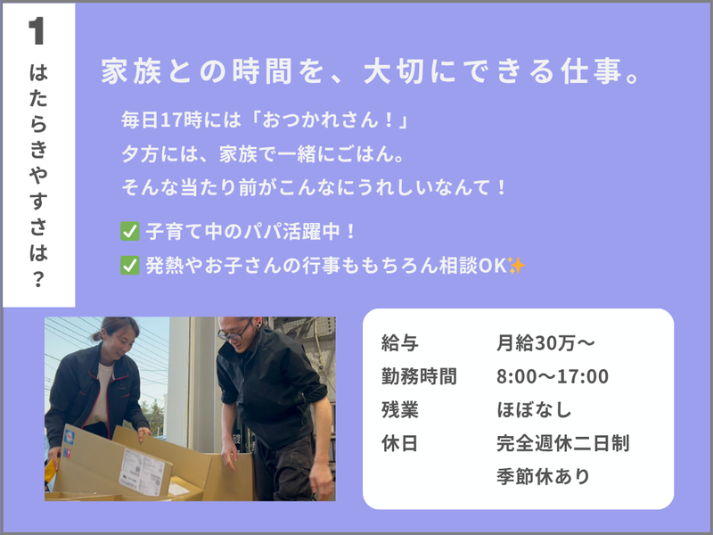 職場環境・雰囲気 | 職場環境 \働きやすさ◎/ 「ずっとここで働きたい」と思ってもらえる職場づくりに、 本気で取り組んでいます。 ✅未経験者大活躍! ✅20代・30代のパパさん活躍中✨ ✅日勤のみ・残業少なめ ✅制服貸与(ポロシャツ・前掛けなど) ✅アットホームな社風◎ 喫煙所:喫煙所あり(屋外) 敷地内喫煙可能場所有 受動喫煙対策を行っています。 |
