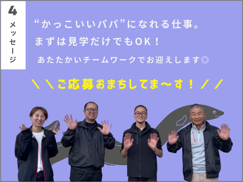 職種/仕事内容 | 仕事内容 \残り1名限定募集!/ まずは職場見学だけでもOK! 実際の現場を見たら、 きっとここで働きたくなるはずです! ✨中庄商店の魅力ポイント✨ ✅未経験から月給30万円以上 ✅残業ほぼゼロ&17時退社 ✅年間休日109日(完全週休2日) ✅うなぎのまかないアリ&手当も充実 ✅転勤なし!安定して長く働ける ✅創業90年以上の安定・成長企業 ✅子育て中のパパも活躍中! 「毎月の安定収入は欲しい。 でも、家族との時間も譲れない──」 そんな想いを抱えるパパさんへ。 創業90年以上の安定基盤を持つ当社なら、 その両方が叶えられます。 未経験からでも月給30万円以上。 残業はほぼなく、繁忙期以外は毎日17時には「おつかれさま」。 実際に、入社3年でマイホームを購入した先輩もいます。 家族との時間を大切にしながら、 安定した収入で未来を築く。 そんな新しい働き方を、ここで始めませんか? ■パパさんが安心のワケは…! ┈┈┈┈┈┈┈┈┈┈┈┈┈┈┈┈•• 結論… 安定収入×家族時間、 これがどちらも叶えられるから! 詳細に関しては… ✅月給30万円以上の安定収入◎ 頑張り次第で給与に反映 ・固定残業代は含んでいますが、 実際の残業はほぼゼロ! (※丑の日を除く) ・賞与年2回&昇給年1回あり! ・こども手当(1人1万円/月 ※15歳まで)で 子育てを応援! 【年収例】 入社2~3年目:430万円 入社4~5年目:500万円 ✅夕方は家族と一緒に ほぼ毎日、17時に「おつかれさま」 土用の丑の日以外は、残業ほぼゼロ! 朝は早いけど、そのぶん終業も早め。 17時にはほとんどのスタッフが退勤して、 家族とご飯を食べたり、 子どもとお風呂に入ったり…。 “家族との時間”を大切にできる働き方が、 ここにあります。 ✅休みも充実 ・完全週休二日 ・年間のお休みは実質114日◎ ・長期休暇あり └お盆(2日)と年末年始(2日)に “季節休”をご用意。 公休や有給と組み合わせれば、 4連休以上の長期休暇も可能です! ✅子育て世代が多い職場 ・上司・先輩も現役のパパさんたち! ・発熱や行事など、家庭都合に理解ある環境です✨ ✅働きやすさも抜群 ・転勤なし ・車通勤OK&交通費支給あり ✅収入アップの道筋も明確 ・自社「鰻さばき検定」合格で月2万円手当 ・昇給:あり(年1回) やる気とスピードをしっかり評価✨ ・ジョブローテーションで役割が広がり、 収入UPにも直結 (例)検定合格後の月収 →301,110円+手当20,000円=321,110円 ■ただの作業じゃない。 “鮮度を守るプロ” の仕事です ┈┈┈┈┈┈┈┈┈┈┈┈┈┈┈┈•• あなたに今回お任せするのは うなぎを仕分けてさばいたり、 梱包する業務です。 といっても、 いきなり職人のような作業をするわけではありません。 まずはうなぎのサイズごとの仕分けや、 出荷先ごとの梱包など、 簡単な作業からスタート。 少しずつステップを踏みながら、 「うなぎを捌く技術」も身につけていける環境です。 【仕分け作業】 鰻・水・氷を袋に詰める ↓ 空気を充填 ↓ 段ボールに詰める ↓ 宅配業者に引き渡し 段ボールに入った段階での重さは 20~25キロ前後! 腰への負担も少なめなので、 腰痛を気にせず働けるのも嬉しいポイントです✨ また、分業体制が整っているため、 接客や配送は基本なし◎ “鰻と向き合う仕事”に集中できるので、 自然と成長スピードも早くなるんです。 ▼未経験の方の育成ステップ  ̄ ̄ ̄ ̄ ̄ ̄ ̄ ̄ ̄ ̄ ̄ ̄ ̄ ̄ ̄ ̄ ̄ 「鰻さばけます!」なんて方、 めっちゃくちゃレアです(笑) なので、ほとんどの先輩が未経験からのスタート。 「魚なんてさばいたことない」という方も大丈夫です! 〈STEP①〉 仕分け・梱包作業からスタート 〈STEP②〉 現場の主任がマンツーマンでOJT └背中を見せながら、 実際のやり方を少しずつ教えます。 〈STEP③〉 流れを覚えて、 鰻のサイズ・色などの見極めができるように 〈STEP④〉 いよいよ捌き作業へチャレンジ! ✅ 約1週間で仕事の流れがつかめます ✅ 2ヶ月で「さばき職人デビュー」する方も! ✅ 半年後には、ほとんどの方が「さばき職人」デビュー! ▼「できるかな…」と不安な方へ  ̄ ̄ ̄ ̄ ̄ ̄ ̄ ̄ ̄ ̄ ̄ ̄ ̄ ̄ ̄ ̄ ̄ 大丈夫。 はじめから鰻がさばける人なんて、 ほとんどいません。 道具の持ち方、鰻の扱い方、包丁の使い方… すべて現場の中で、ゆっくり覚えていけます。 仕入れのうなぎも、 しっかり“練習用”を確保しているので 失敗してもOK。 焦らず、じっくり取り組めますよ! |