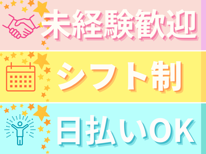 対象となる方 | 求めている人材 【こんな人におすすめ!】 未経験×一人でモクモクとやりたい方 \未経験大歓迎!サポート体制充実!/ ⭐⭐電話対応・嫌な人間関係なし⭐⭐ 自分のペースでモクモク作業! 専任担当者が24時間対応! どんな相談でもOK!! 【歓迎要件】 ・将来的に正社員を目指したい方 ・未経験者/経験者問わずOKです! ・コツコツ/モクモクとした作業が好きな方 ・チームワークを大切にできる方 業界大手企業なので、安定して稼げる 優良企業なので、負担が少ない ◎未経験大歓迎! しっかりとした研修制度が 整っているので安心です。 ◎フリーター、主婦・主夫の方も 積極採用中! 現場見学も可能ですので、 実際の仕事環境を見てから決められます。 まずはお気軽にお問い合わせください♩ ■急募 ■学歴不問 ■経歴不問 ■経験者歓迎 ■男性活躍中 ■女性活躍中 ■未経験OK ■ブランクOK ■主婦・主夫歓迎 ■フリーター歓迎 ■WワークOK ■第二新卒歓迎 ■業界未経験歓迎 ■未経験者歓迎 ■知識不要 ■経験不要 |