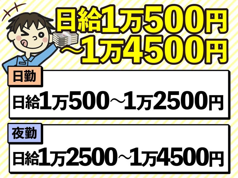 給与 | 日給10,500円~14,500円 給与詳細 基本給:日給 1万500円 〜 1万4500円 固定残業代:なし 【一律手当】 全員に一律で支払われる通勤・皆勤・家族手当金額:なし 全員に一律で支払われるその他手当金額:なし 日勤/日給1万500円~1万2500円 夜勤/日給1万2500円~1万4500円 ・昇給あり(規定有) ・賞与あり(規定有) ・週払いok(土曜日〆火曜日払い) 【給与例】 給与例 ■決まった曜日に無理なく働きたいシニアの方(週3日勤務) 日給1万500円×12日=月収12万6000円 ■ガッツリ働くフリーターさん(週6日勤務) 日給1万500円×24日=月収25万2000円 ■夜勤で効率よく稼ぎたいWワーカー(週5日勤務) 日給1万2500円×20日=月収25万円 |