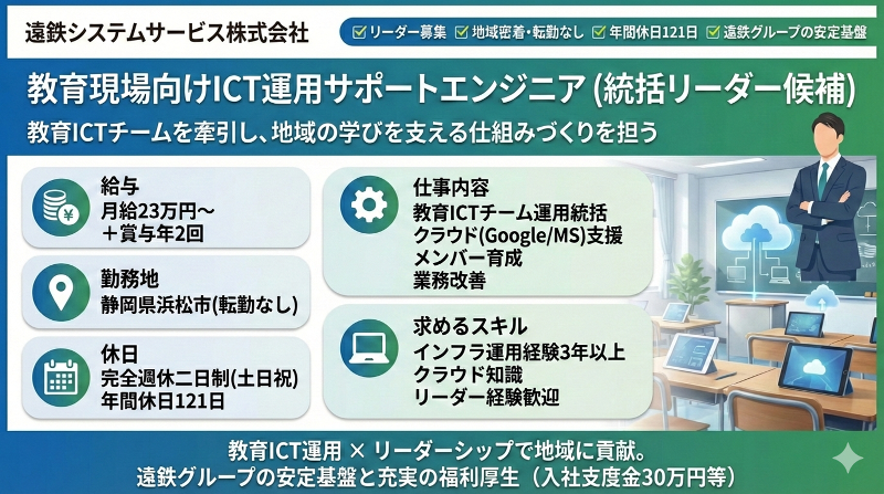 職種/仕事内容 | 仕事内容: ■業務概要 静岡県浜松市を中心とする教育機関向けに、ICTサポートチームの運用管理・業務改善を担うリーダー候補ポジションです。 ■対象 ・小中学校の GIGAスクール構想に基づく端末/ネットワーク環境 ・Google Workspace for Education ・Microsoft 365 Education ・教育現場の無線LAN環境・学習管理端末(iPad/Chromebook/Windows端末)など ■業務内容 ・教育委員会・学校からのICT関連問い合わせ対応の統括 ・Google Workspace / Microsoft365 の運用支援や設定指導 ・チームメンバーへの技術指導・育成管理 ・業務フロー改善やマニュアル整備の推進 ・問い合わせ件数・対応品質の管理、報告業務 ・教育現場へのリモート・訪問対応や技術支援調整 ■環境 ・OS:Windows 10/11、ChromeOS、iPadOS ・クラウド環境:Google Workspace、Microsoft 365 ・その他:社用車または公共交通機関での訪問あり、普通自動車運転免許必須(AT可) ■体制 ・教育ICTサポートチーム内で、マネージャーや他リーダー候補と連携 ・各案件対応ユニット(2-4名)を統括する立場 ・メンバーへのOJTやメンタリングを担う立場 ・社内ヘルプデスク部門、SE部門とも連携 ・現地訪問対応あり |