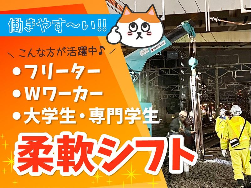 待遇・福利厚生 | 【保険制度】 雇用保険、労災保険、健康保険、厚生年金 【福利厚生】 待遇・福利厚生 【福利厚生】 ◆昇給あり ◆日・週払い可能 ◆各手当あり ◆正社員登用あり ◆交通費規定支給 ◆法定研修あり(3日間:研修手当2万8,000円) ◆列車見張員は日給+1000円 ◆入社祝い金10万円! ◆社会保険完備 ◆個室寮完備 ◆資格取得支援制度あり(会社全額負担) ◆制服・作業道具類貸与 ◆直行・直帰可能 ◆Wワーク可能 ◆短期・週末のみも可能 ◆出張面接(最寄駅まで)可能 ◆バイク・車通勤可 ◆髪型髪色自由 ◆髭&ピアスOK |