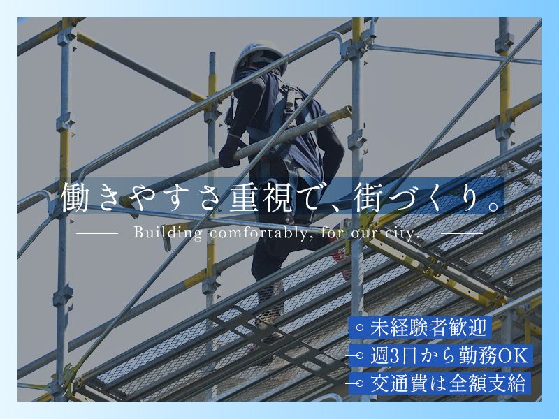 職種/仕事内容 | 仕事内容 \当社で働くポイント/ ✨未経験からのチャレンジOK ✨万全な教育体制で成長をサポート ✨週3日から働ける柔軟なシフト制 ✨ほぼ残業なし!早上がり可能 =============== 【 仕事内容 】 足場工事に関わる現場作業全般。 主に手がけるのは、首都圏内の 低層住宅です。高くても10mほど。 案件の9割が新築工事になります。 ●対応エリア ・東京都7割、埼玉県3割程度 ・会社から片道約1時間の現場が多い ・場合によっては直行直帰OK ●ポイント ・進捗状況によっては早上がり可能 ・創業以来、重大事故のない安全企業 ・ジョブローテーションの導入を予定中 |