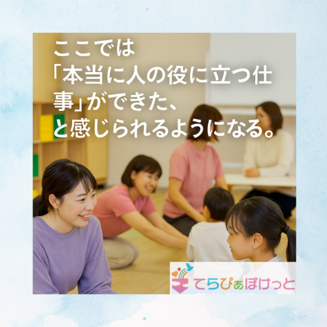 職種/仕事内容 | 仕事情報 ● 仕事内容 通所する年長さんまでの児童に対して一対一、または最大3人の小集団に、ABAの療育を行ないます。 支援方針、行うプログラムは支援計画に基づいて、教室内の職員で検討をしています。 療育も、それ以外の業務も研修、マニュアルがありますから、一つ一つ教わりながら身につけていく事ができます。 最初は誰でも同じ不安を 私たちの職員も最初は同じでした。 「この対応で合ってるのかな?」 「ABAって本当に役立つの?」 毎日の中で、立ち止まってしまう瞬間は誰にでもあります。 こういう経験ありませんか 子どもに何度伝えても同じ行動が繰り返されるとき。 「どう接したらいいか分からない」と思ったとき。 保護者に「最近ちょっと変わったんです」と言われて、胸が熱くなったとき。 そんな場面に出会ったことはありませんか? 学びを支える仕組みがある てらぴぁぽけっとでは、全職員が「言葉の発達の遅れ」に対するプログラムを理解し、実践しています。 さらに、集団生活・生活動作・コミュニケーション行動など、子どもの成長に直結する支援を研修から学び、現場で試し、また学ぶ――そんな循環を整えています。 一緒に成長できる喜び 子どもの「できた!」に立ち会える。 ご家族から「家でも変わってきました」と感謝される。 数ヶ月前とは全く違う姿に、自分の成長まで感じられる。 将来的に児発管や相談支援専門員を目指せるキャリアステップがあります。 |