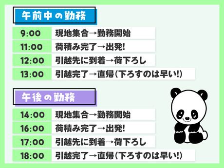 勤務時間 | シフト制 勤務時間 8:00~17:00 *上記時間内で、1日4時間勤務 例)8:00~12:00、13:00~17:00 ◎1日4時間ポッキリ!働きたい日の前日12時迄に申請OK ◎日払い制度あり!スマホ決済アプリで給与受取できる! ◎未経験OK!2~5人のチーム制◎研修も充実! ◎交通費全額支給♪勤務地多数!直行直帰可! ◎AI面接実施中!スマホ1つで面接まで完結! ◎3月4月は1勤務あたり500円~3,000円を支給(規定有)★ |